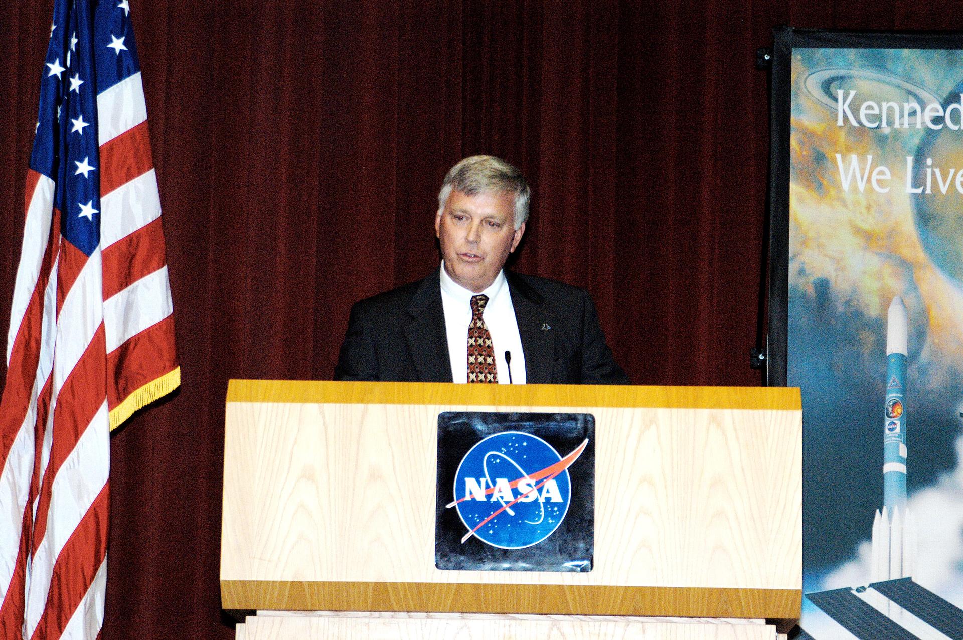 KENNEDY SPACE CENTER, FLA. - KSC Deputy Director James W. Kennedy addresses a group of KSC employees assembled in the KSC Training Auditorium. The occasion is the announcement of Kennedy as the next director of the NASA Kennedy Space Center (KSC) in Florida. He has served as KSC's deputy director since November 2002. He will succeed KSC Director Roy D. Bridges, who was appointed on June 13 to lead NASA's Langley Research Center, Hampton, Va.