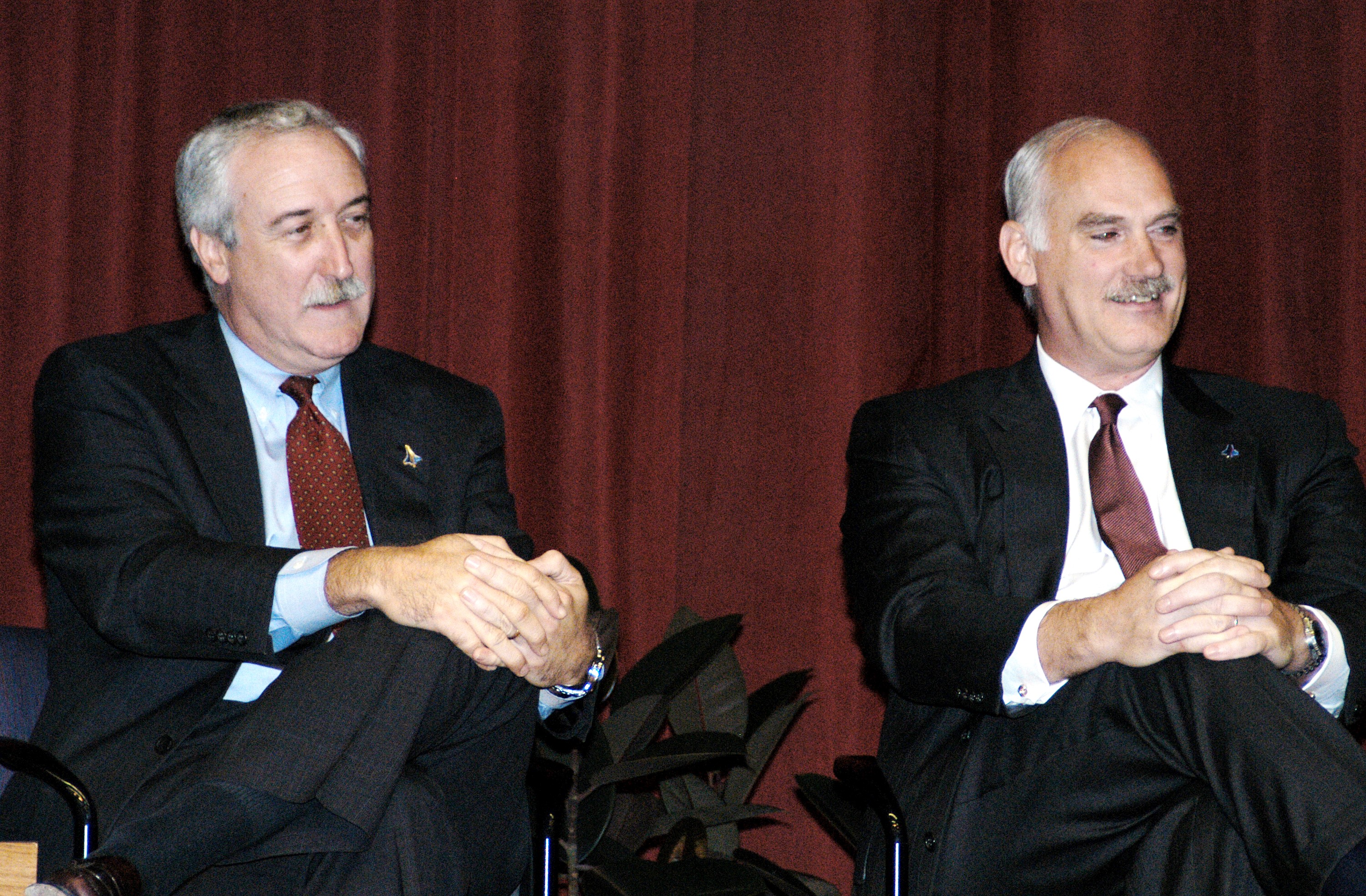 KENNEDY SPACE CENTER, FLA. - NASA Administrator Sean O'Keefe (left) and NASA Associate Administrator of Space Flight William F. Readdy address a group of KSC employees assembled in the KSC Training Auditorium. The occasion is the announcement of James W. Kennedy as the next director of the NASA Kennedy Space Center (KSC) in Florida. Kennedy has served as KSC's deputy director since November 2002. He will succeed KSC Director Roy D. Bridges, who was appointed on June 13 to lead NASA's Langley Research Center, Hampton, Va.