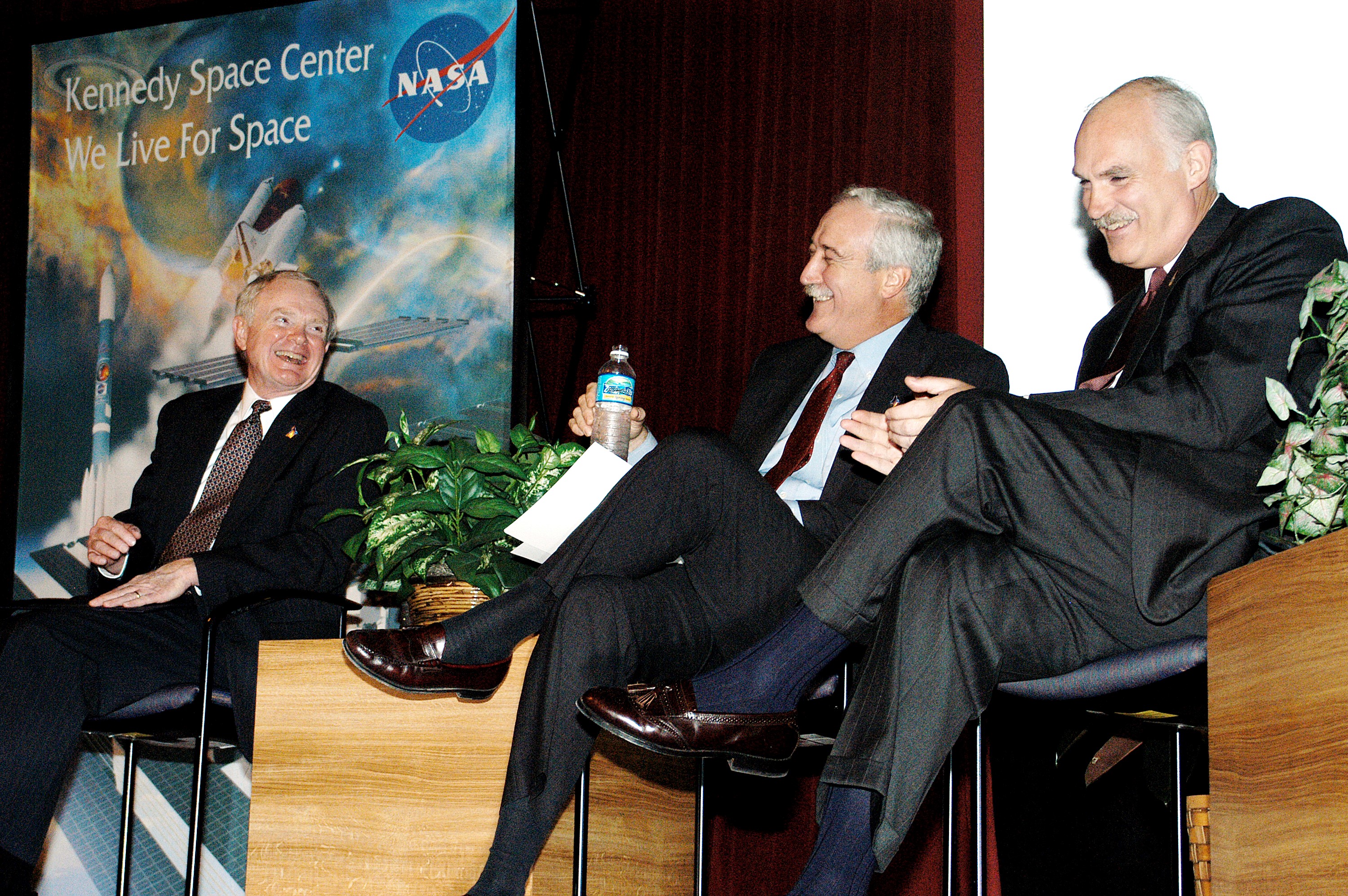 KENNEDY SPACE CENTER, FLA. - From left, KSC Director Roy D. Bridges, NASA Administrator Sean O'Keefe, and NASA Associate Administrator of Space Flight William F. Readdy share a light moment on the stage in the KSC Training Auditorium. The occasion is the announcement of James W. Kennedy as the next director of the NASA Kennedy Space Center (KSC) in Florida. Kennedy has served as KSC's deputy director since November 2002. He will succeed Bridges, who was appointed on June 13 to lead NASA's Langley Research Center, Hampton, Va.