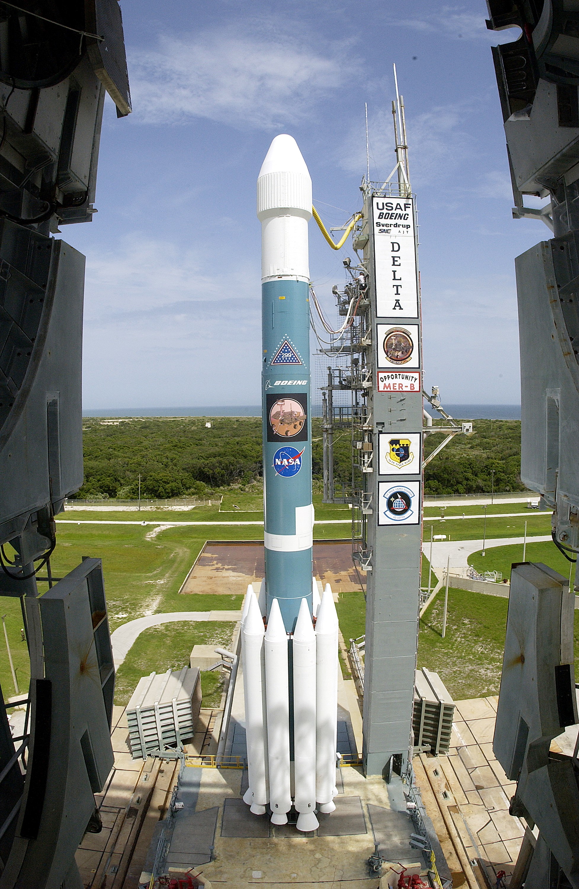 KENNEDY SPACE CENTER, FLA. - The Mobile Service Tower is rolled back at Space Launch Complex 17B, Cape Canaveral Air Force Station, to reveal the Delta II Heavy launch vehicle ready for launch of the Mars Exploration Rover-B (MER-B) mission, with the rover "Opportunity" aboard. The second of twin rovers being sent to Mars, it is equipped with a robotic arm, a drilling tool, three spectrometers, and four pairs of cameras that allow it to have a human-like, 3D view of the terrain. Each rover could travel as far as 100 meters in one day to act as Mars scientists' eyes and hands, exploring an environment where humans are not yet able to go. MER-B is scheduled to launch on June 28 at one of two available times, 11:56:16 p.m. EDT or 12:37:59 a.m. EDT on June 29.