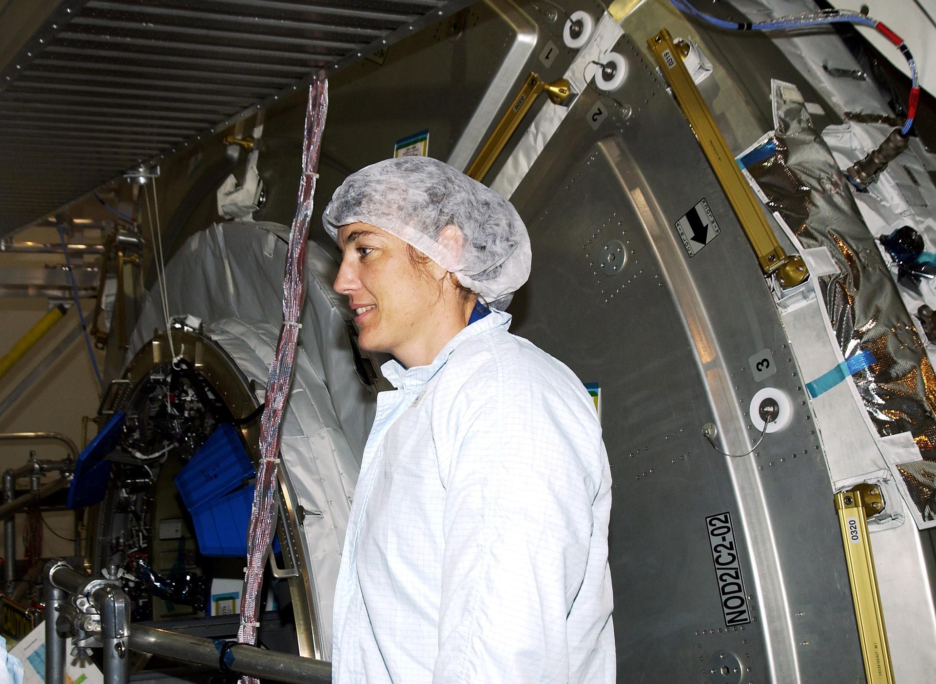 KENNEDY SPACE CENTER, FLA. - In the Space Station Processing Facility, STS-115 Mission Specialist Heidemarie Stefanyshyn-Piper (left) gets ready to check out the Japanese Experiment Module (JEM) Pressurized Module. Known as Kibo, the JEM consists of six components: two research facilities -- the Pressurized Module and Exposed Facility; a Logistics Module attached to each of them; a Remote Manipulator System; and an Inter-Orbit Communication System unit. Kibo also has a scientific airlock through which experiments are transferred and exposed to the external environment of space. The various components of JEM will be assembled in space over the course of three Space Shuttle missions. The STS-115 mission will deliver the second port truss segment, the P3/P4 Truss, to attach to the first port truss segment, the P1 Truss, as well as deploy solar array sets 2A and 4A.. The crew is scheduled to activate and check out the Solar Alpha Rotary Joint (SARJ) and deploy the P4 Truss radiator.