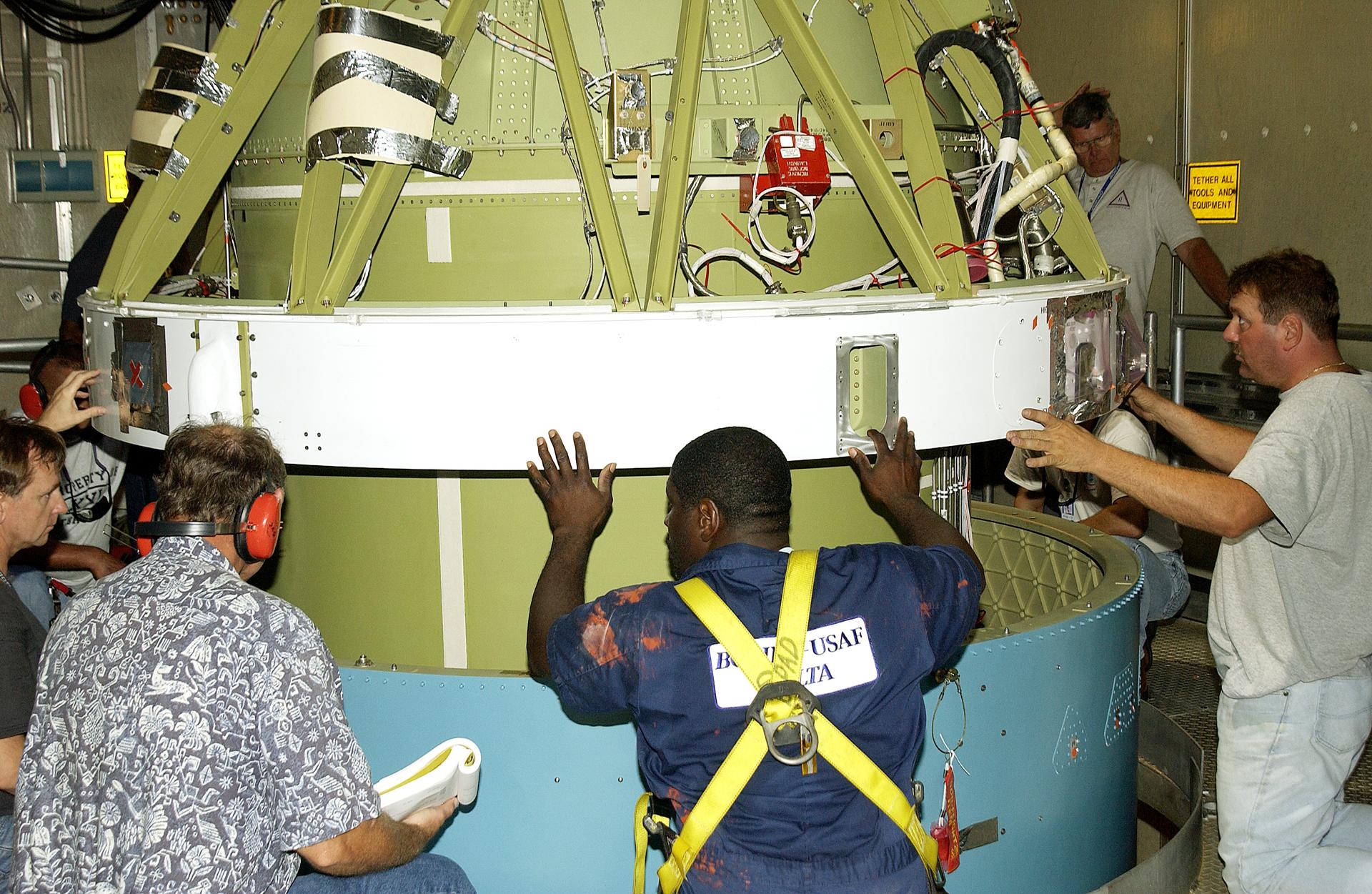 Workers help guide the second stage of the Delta II Heavy rocket onto the first stage, below. The rocket will launch the Space Infrared Telescope Facility (SIRTF), currently scheduled for mid-August. SIRTF consists of three cryogenically cooled science instruments and an 0.85-meter telescope, and is one of NASA's largest infrared telescopes to be launched. SIRTF will obtain images and spectra by detecting the infrared energy, or heat, radiated by objects in space. Most of this infrared radiation is blocked by the Earth's atmosphere and cannot be observed from the ground.