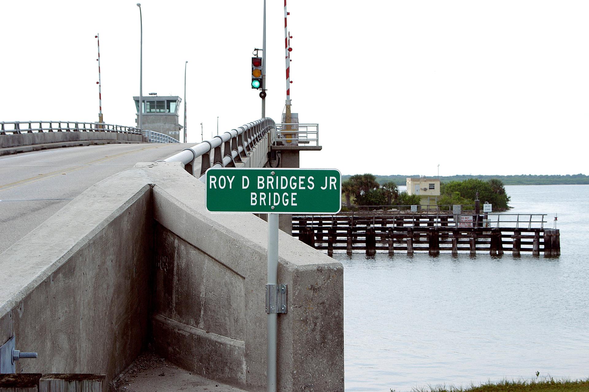 KENNEDY SPACE CENTER, FLA. - A new sign is in place on the NASA Causeway naming the bridge for departing KSC Director Roy D. Bridges Jr. Bridges is leaving KSC to become the director of NASA's Langley Research Center, Hampton, Va. The bridge spans the Banana River on the NASA Causeway and connects Kennedy Space Center and Cape Canaveral Air Force Station.
