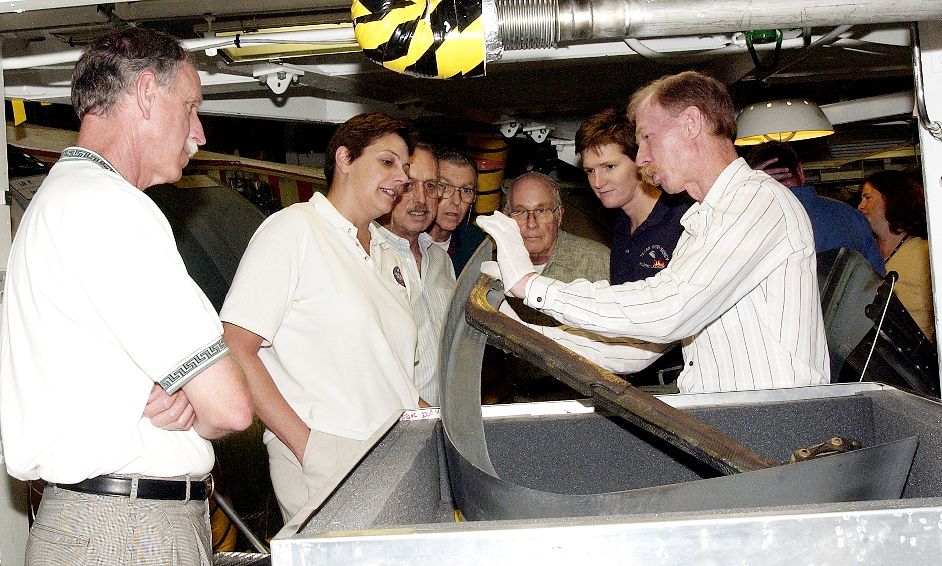 KENNEDY SPACE CENTER, FLA. - On a tour of the Orbiter Processing Facility, members of the Stafford-Covey Return to Flight Task Group (RTFTG) look at a Reinforced Carbon-Carbon panels with a T-seal held by Tom Roberts, with United Space Alliance. From left are Richard O. Covey, former Space Shuttle commander, Dr. Kathryn Clark, James Adamson, Joe Engle, William Wegner and Dr. Amy Donahue. Chairing the task group are Covey and Thomas P. Stafford, Apollo commander. Chartered by NASA Administrator Sean O’Keefe, the task group will perform an independent assessment of NASA’s implementation of the final recommendations by the Columbia Accident Investigation Board.