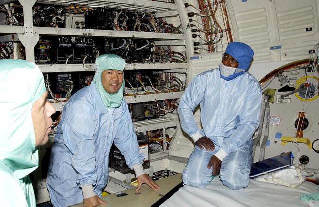 KENNEDY SPACE CENTER, FLA. - In the midbody of orbiter Atlantis, STS-114 crew members look over equipment under the eyes of a technician. At left are Pilot James Kelly and Mission Specialist Soichi Noguchi. They and Commander Eileen Collins and Mission Specialist Stephen Robinson are at KSC for equipment familiarization. Noguchi is with the Japanese space agency NASDA. Mission STS-114 will carry the MultiPurpose Logistics Module (MPLM) Raffaello and External Stowage Platform 2 to the International Space Station. The MPLM will contain supplies and equipment. Another goal of the mission is to remove and replace a Control Moment Gyro. Launch date for mission STS-114 is under review.