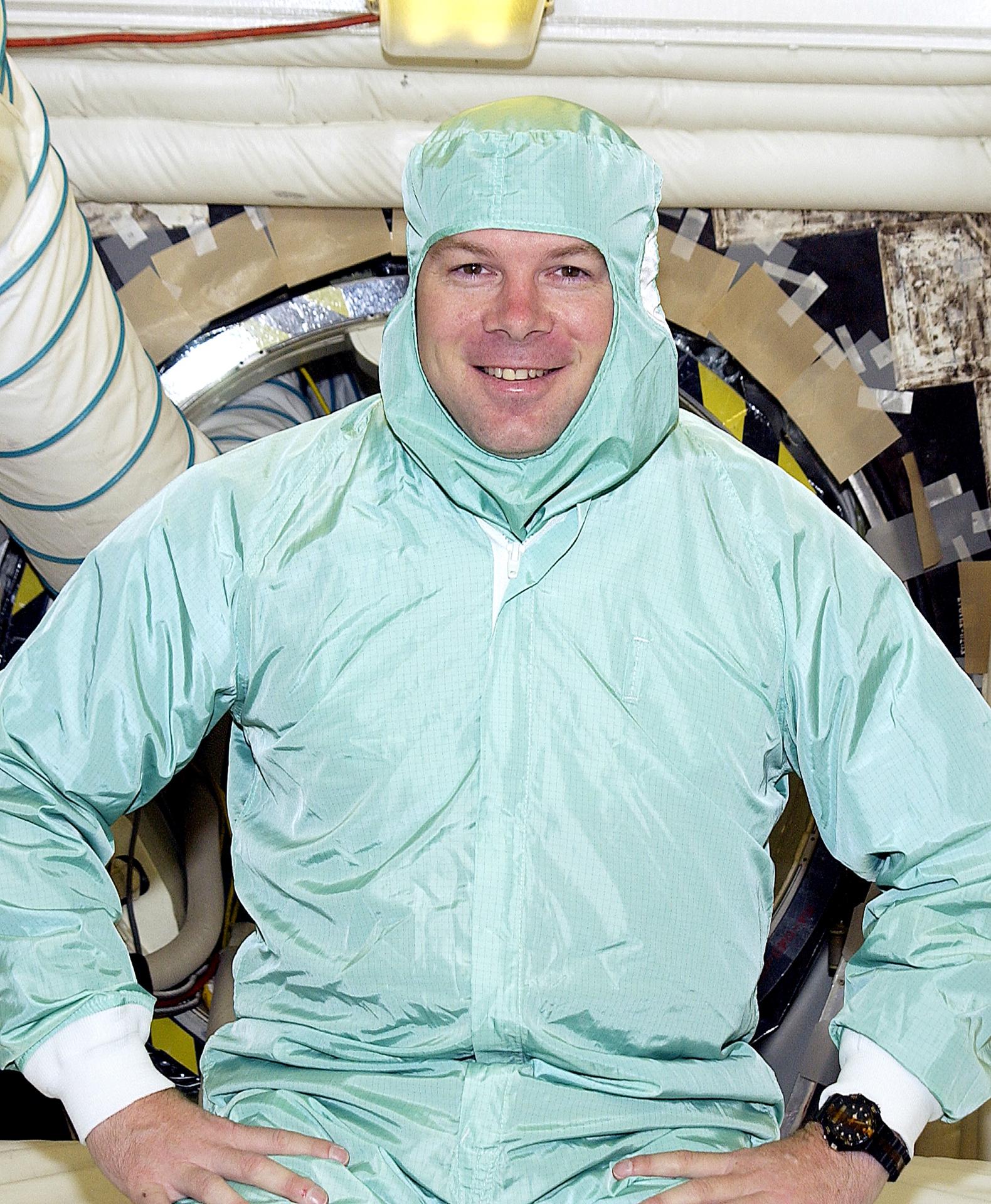 KENNEDY SPACE CENTER, FLA. - STS-114 Pilot James Kelly sits in the entry hatch to orbiter Atlantis. He and other crew members - Commander Eileen Collins and Mission Specialists Soichi Noguchi and Stephen Robinson - are at KSC for equipment familiarization. Noguchi is with the Japanese space agency NASDA. Mission STS-114 will carry the MultiPurpose Logistics Module (MPLM) Raffaello and External Stowage Platform 2 to the International Space Station. The MPLM will contain supplies and equipment. Another goal of the mission is to remove and replace a Control Moment Gyro. Launch date for mission STS-114 is under review.
