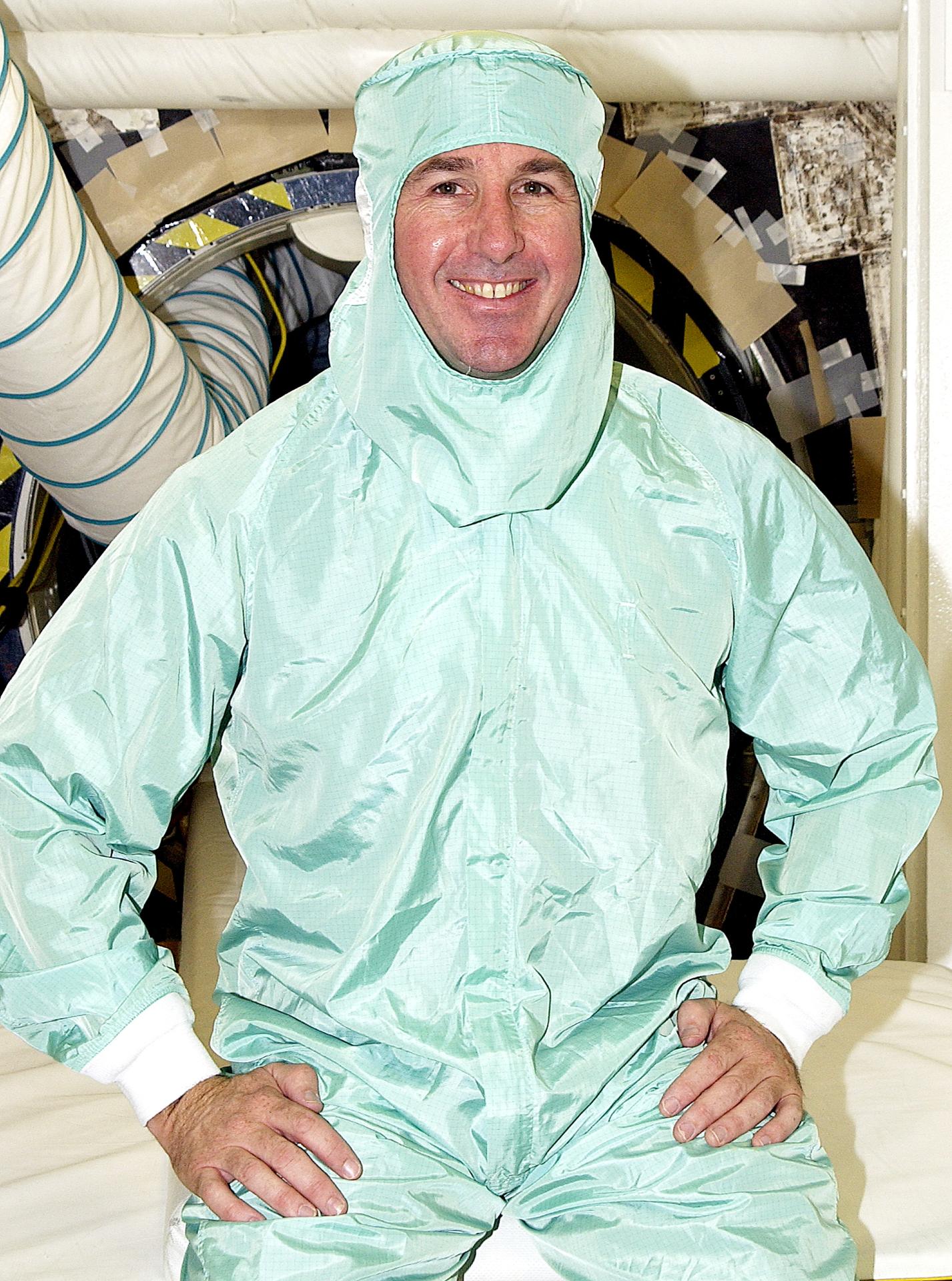 KENNEDY SPACE CENTER, FLA. - STS-114 Mission Specialist Stephen Robinson sits in the entry hatch to orbiter Atlantis. He and other crew members - Commander Eileen Collins, Pilot James Kelly and Mission Specialist Soichi Noguchi - are at KSC for equipment familiarization. Noguchi is with the Japanese space agency NASDA. Mission STS-114 will carry the MultiPurpose Logistics Module (MPLM) Raffaello and External Stowage Platform 2 to the International Space Station. The MPLM will contain supplies and equipment. Another goal of the mission is to remove and replace a Control Moment Gyro. Launch date for mission STS-114 is under review.