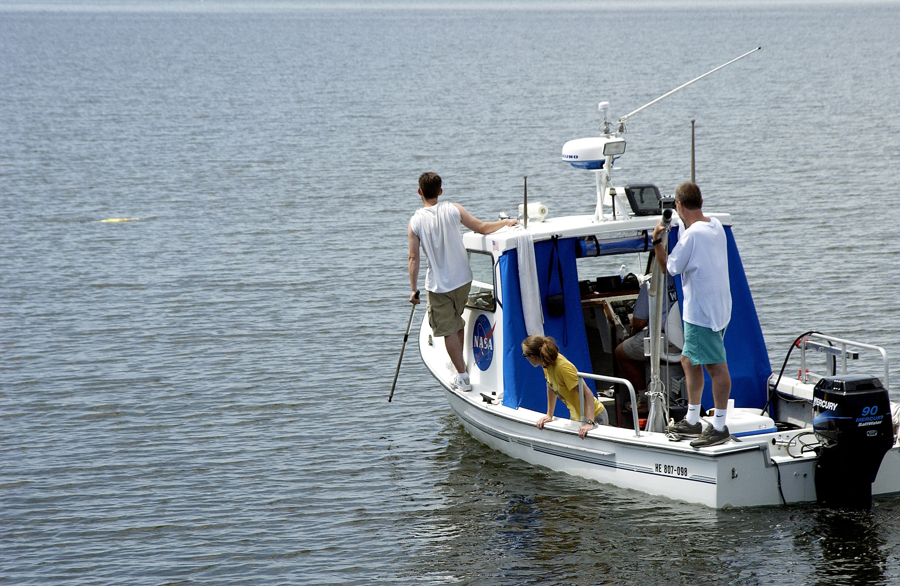 KENNEDY SPACE CENTER, FLA. - Research team members aboard one of the watercraft being utilized to conduct underwater acoustic research in the Launch Complex 39 turn basin monitor some of the project's equipment just released into the water. Several government agencies, including NASA, NOAA, the Navy, the Coast Guard, and the Florida Fish and Wildlife Commission are involved in the testing. The research involves demonstrations of passive and active sensor technologies, with applications in fields ranging from marine biological research to homeland security. The work is also serving as a pilot project to assess the cooperation between the agencies involved. Equipment under development includes a passive acoustic monitor developed by NASA’s Jet Propulsion Laboratory, and mobile robotic sensors from the Navy’s Mobile Diving and Salvage Unit.