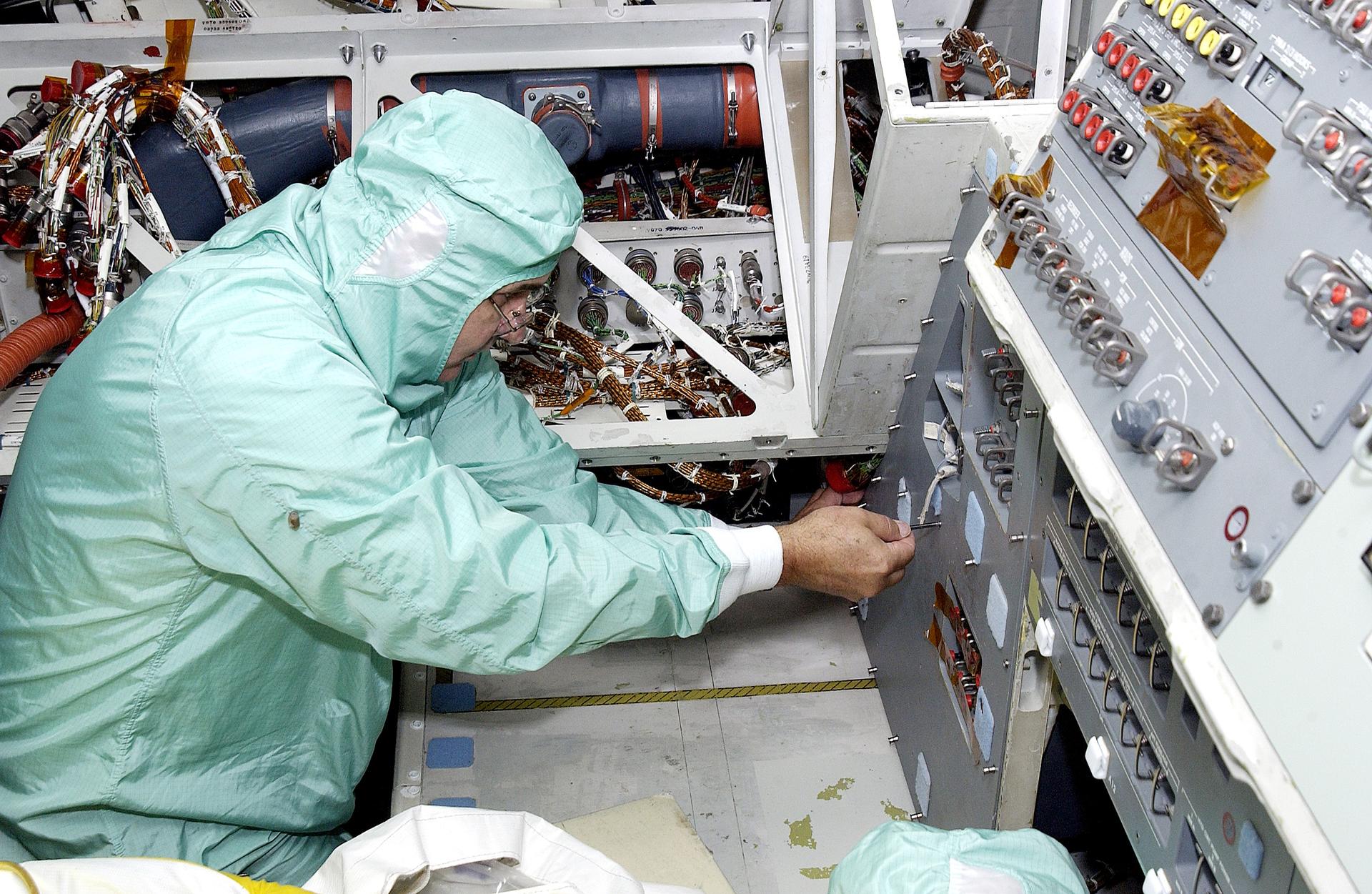 KENNEDY SPACE CENTER, FLA. - A technician with United Space Alliance checks wiring in the mid-body of orbiter Atlantis as part of routine maintenance.