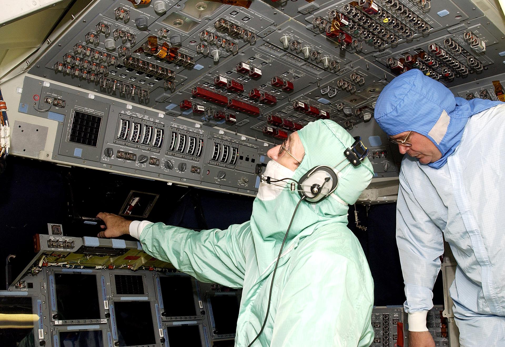 KENNEDY SPACE CENTER, FLA. - During power-up of the orbiter Discovery in the Orbiter Processing Facility, a technician (left) looks at the circuit breaker lights in the cabin. Discovery has been undergoing Orbiter Major Modifications in the past year, ranging from wiring, control panels and black boxes to gaseous and fluid systems tubing and components. These systems were deserviced, disassembled, inspected, modified, reassembled, checked out and reserviced, as were most other systems onboard. The work includes the installation of the Multifunction Electronic Display Subsystem (MEDS) - a state-of-the-art “glass cockpit.”