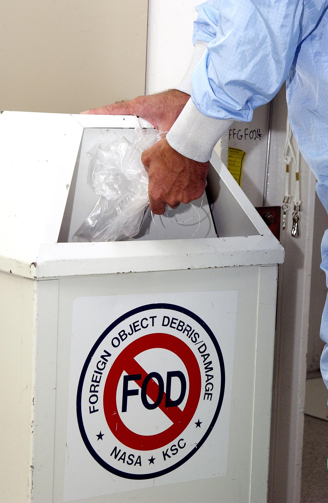 KENNEDY SPACE CENTER, FLA. - A KSC employee dressed in a "bunny suit," standard clean room apparel, disposes of some waste material into a container designated for the purpose. The apparel is designed to cover the hair, clothing and shoes of employees entering a clean room to prevent particulate matter from contaminating the space flight hardware being stored or processed in the room. The suit and container are both part of KSC's Foreign Object Debris (FOD) control program, an important safety initiative.