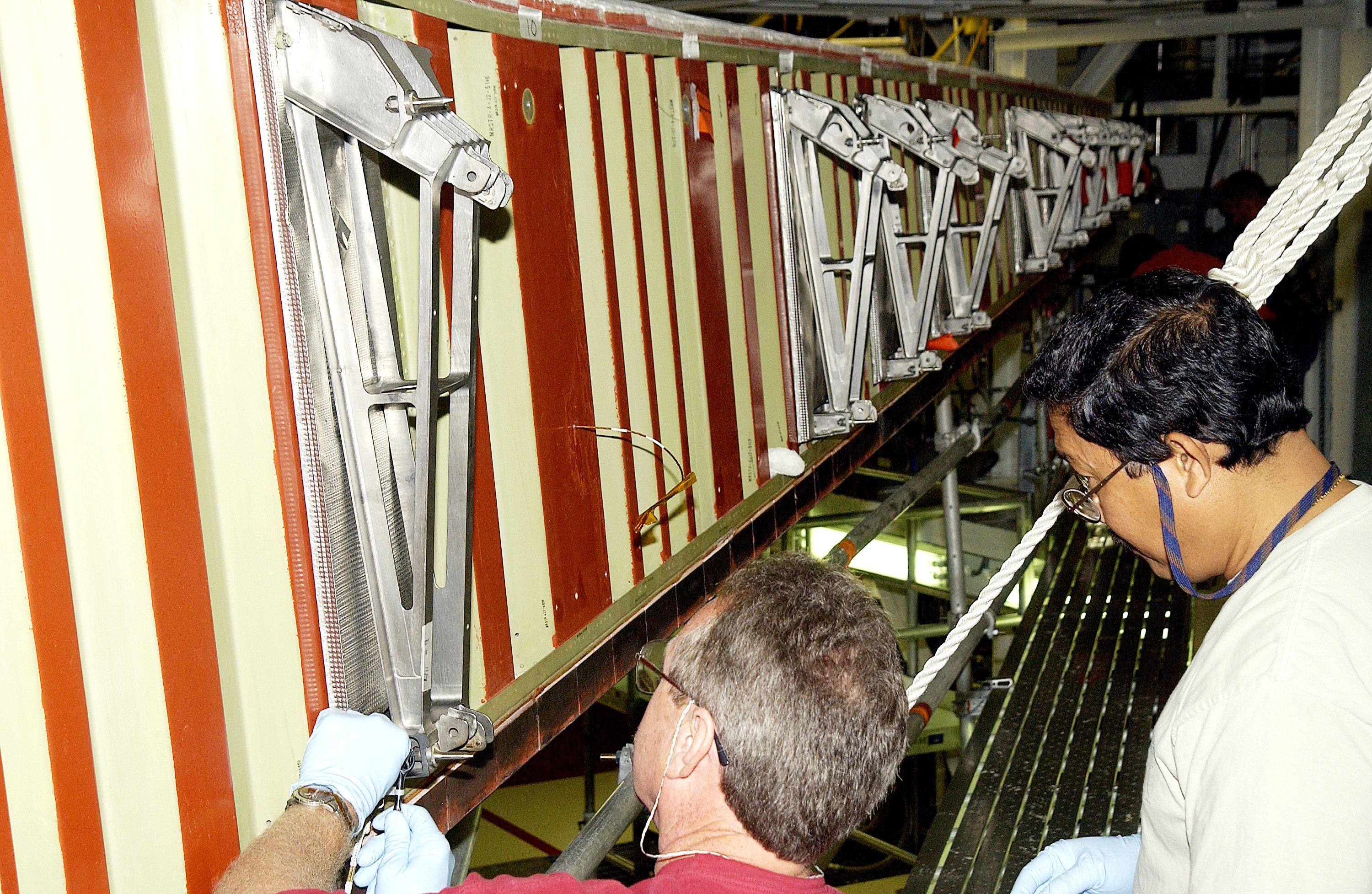KENNEDY SPACE CENTER, FLA. - In the Orbiter Processing Facility, Mike Hyatt (left) and Saul Ngy (right), with United Space Alliance, finish installing a spar on the wing of the orbiter Atlantis. Reinforced Carbon Carbon (RCC) panels are mechanically attached to the wing with a series of floating joints - spars - to reduce loading on the panels caused by wing deflections. The aluminum and the metallic attachments are protected from exceeding temperature limits by internal insulation.