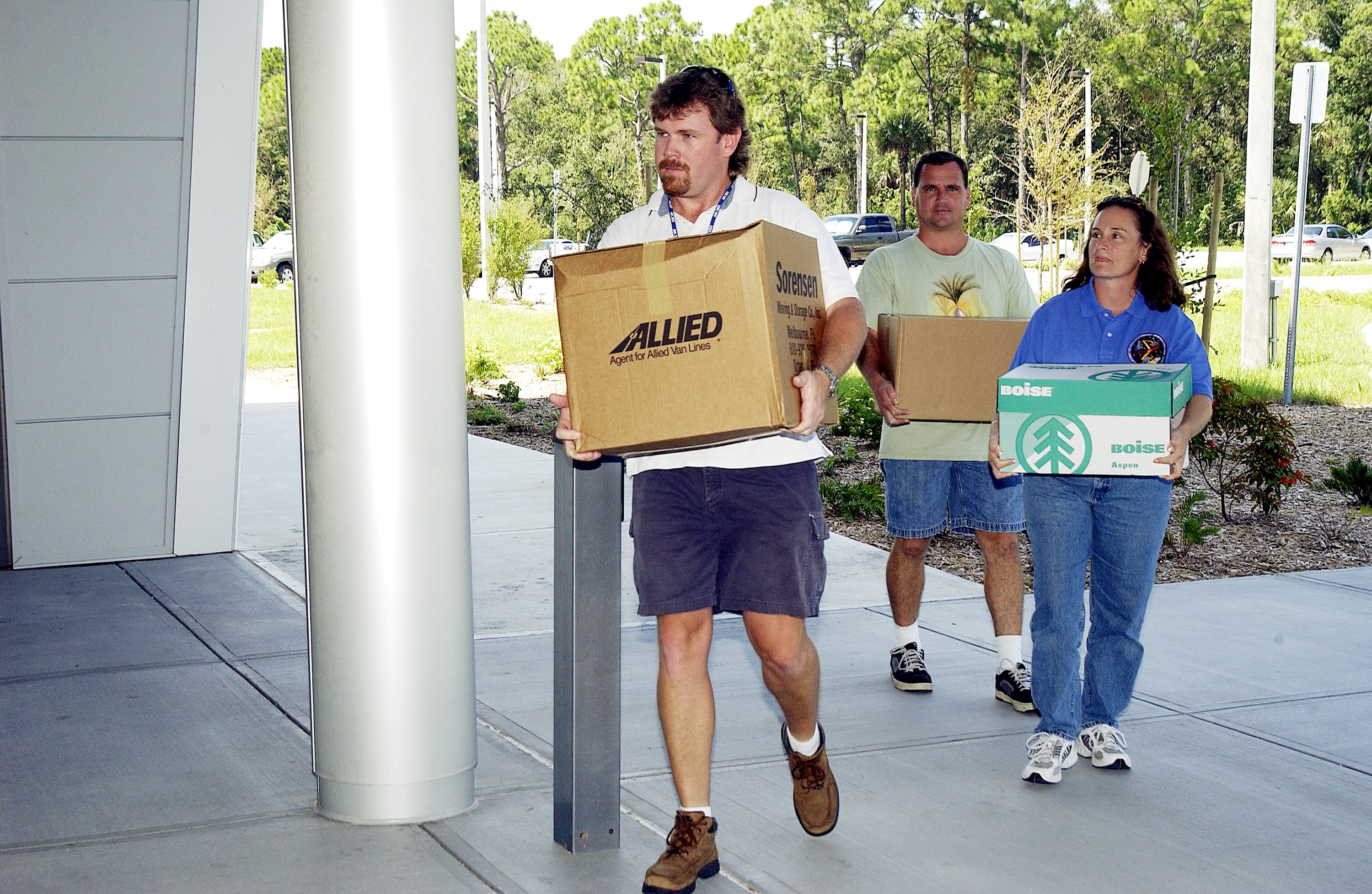 KENNEDY SPACE CENTER, FLA. - Dynamac employees (from left) Larry Burns, Debbie Wells and Neil Yorio carry boxes of hardware into the Space Life Sciences Lab (SLSL), formerly known as the Space Experiment Research and Processing Laboratory (SERPL). They are transferring equipment from Hangar L. The new lab is a state-of-the-art facility being built for ISS biotechnology research. Developed as a partnership between NASA-KSC and the State of Florida, NASA’s life sciences contractor will be the primary tenant of the facility, leasing space to conduct flight experiment processing and NASA-sponsored research. About 20 percent of the facility will be available for use by Florida’s university researchers through the Florida Space Research Institute.