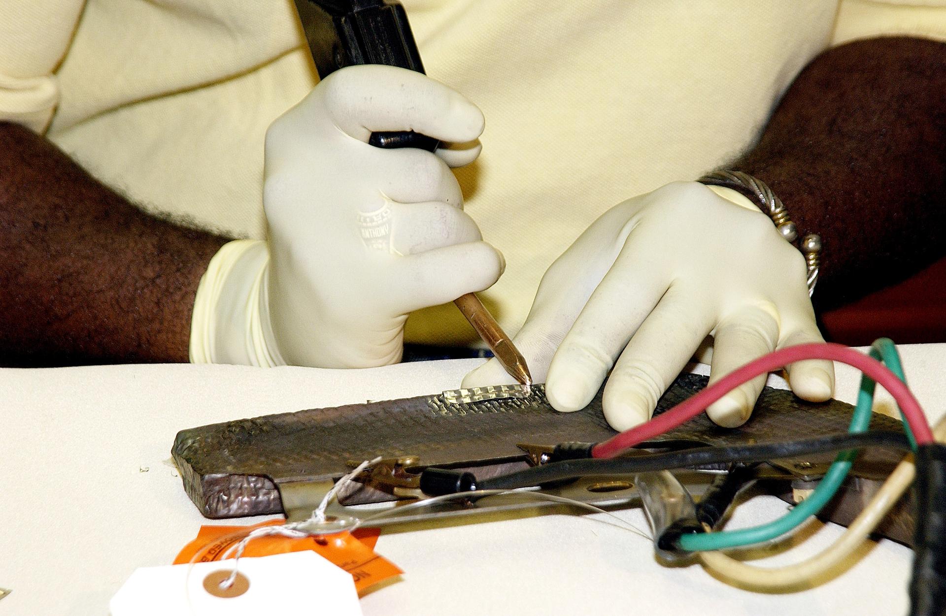 KENNEDY SPACE CENTER, FLA. - United Space Alliance employee Anthony Simmons electrowelds a crack formed in the insulator inside a Reinforced Carbon Carbon panel. The gray carbon composite RCC panels are attached to the leading edge of the wing of the orbiters to withstand the aerodynamic forces experienced during launch and reentry, which can reach as high as 800 pounds per square foot. The operating range of RCC is from minus 250º F to about 3,000º F, the temperature produced by friction with the atmosphere during reentry.