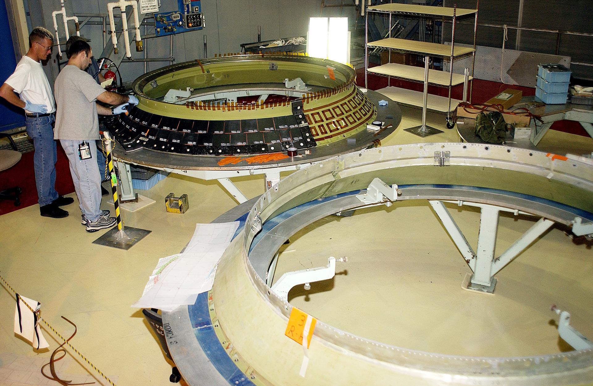 KENNEDY SPACE CENTER, FLA. - While Jay Beason (left), with United Space Alliance, looks on, Jeremy Schwarz (front) and Tom Summers (behind), also with USA, place new tiles on the heat shield of main engine 1 for the orbiter Discovery. A heat shield is a protective layer on a spacecraft designed to protect it from the high temperatures, usually those that result from aerobraking during reentry into the Earth’s atmosphere.