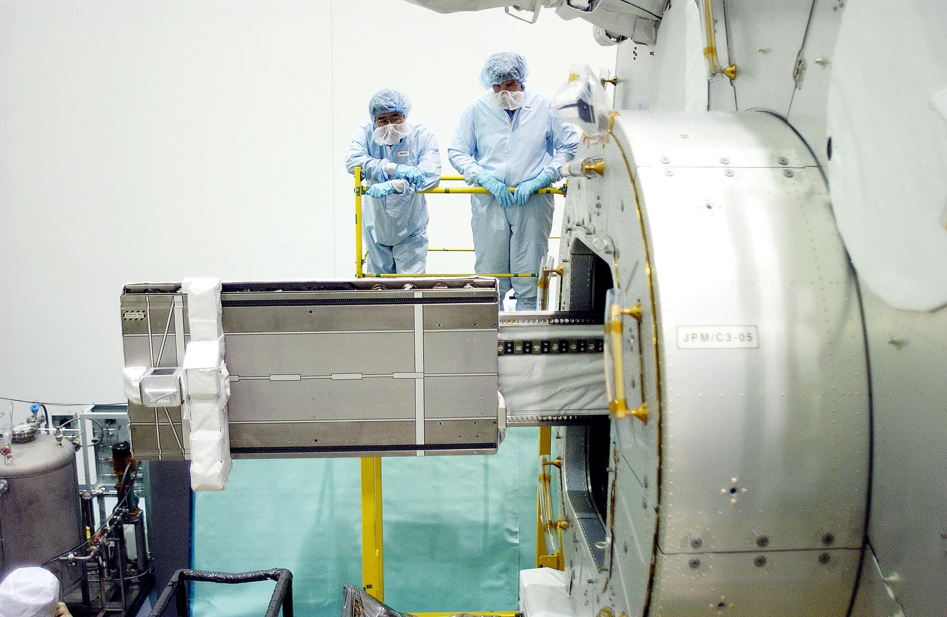 KENNEDY SPACE CENTER, FLA. - In the Space Station Processing Facility, Japanese astronaut Koichi Wakata (top left) and technicians watch as a tray is extended from inside the Pressurized Module, or PM, part of the Japanese Experiment Module (JEM). The PM provides a shirt-sleeve environment in which astronauts on the International Space Station can conduct microgravity experiments. There are a total of 23 racks, including 10 experiment racks, inside the PM providing a power supply, communications, air conditioning, hardware cooling, water control and experiment support functions.