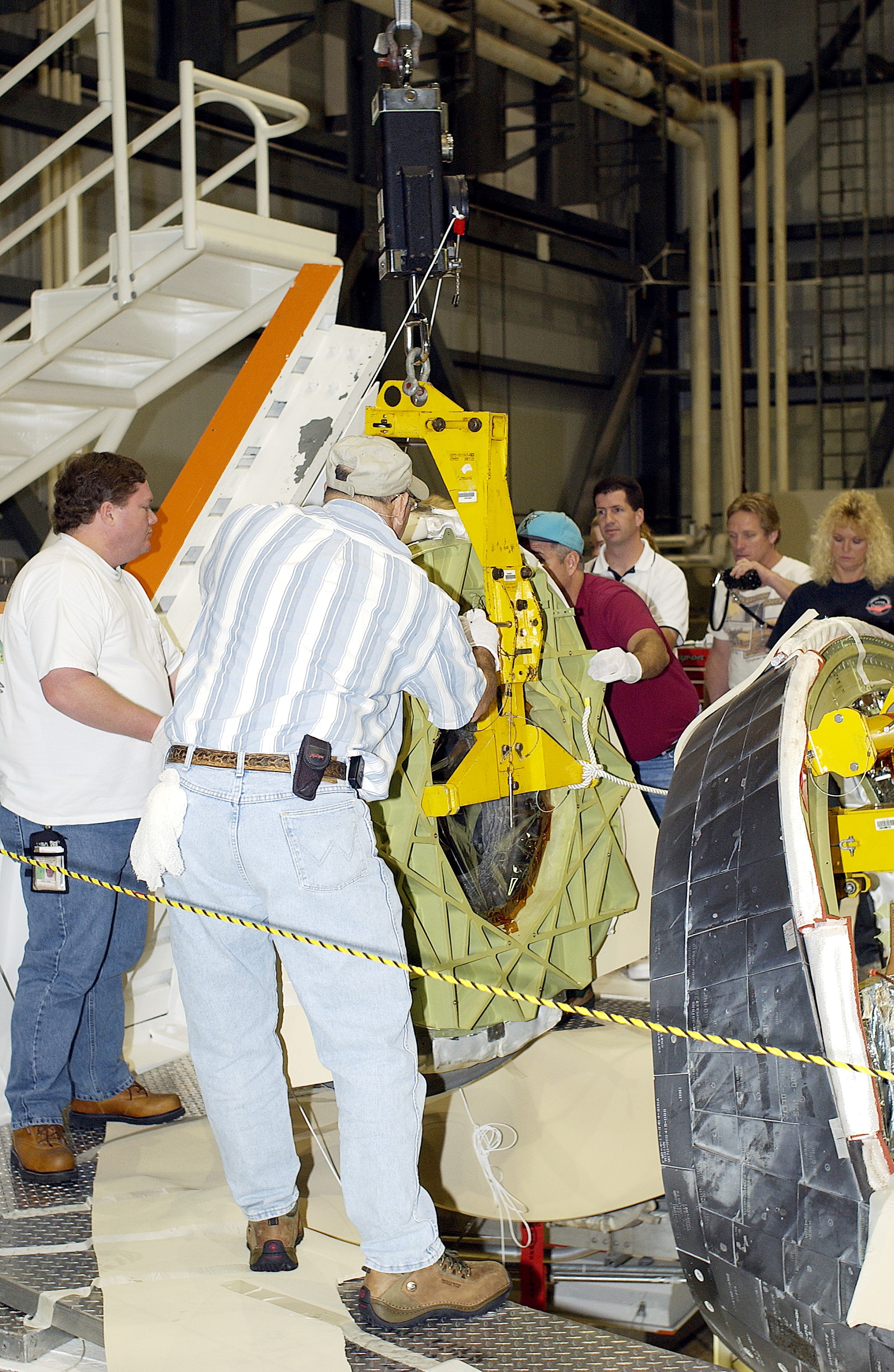 KENNEDY SPACE CENTER, FLA. - In the Orbiter Processing Facility, workers secure the nose cap of the orbiter Atlantis for its transfer to a stand. The cap was removed for routine inspection. The nose cap is made of reinforced carbon-carbon (RCC), which has an operating range of minus 250° F to about 3,000° F.