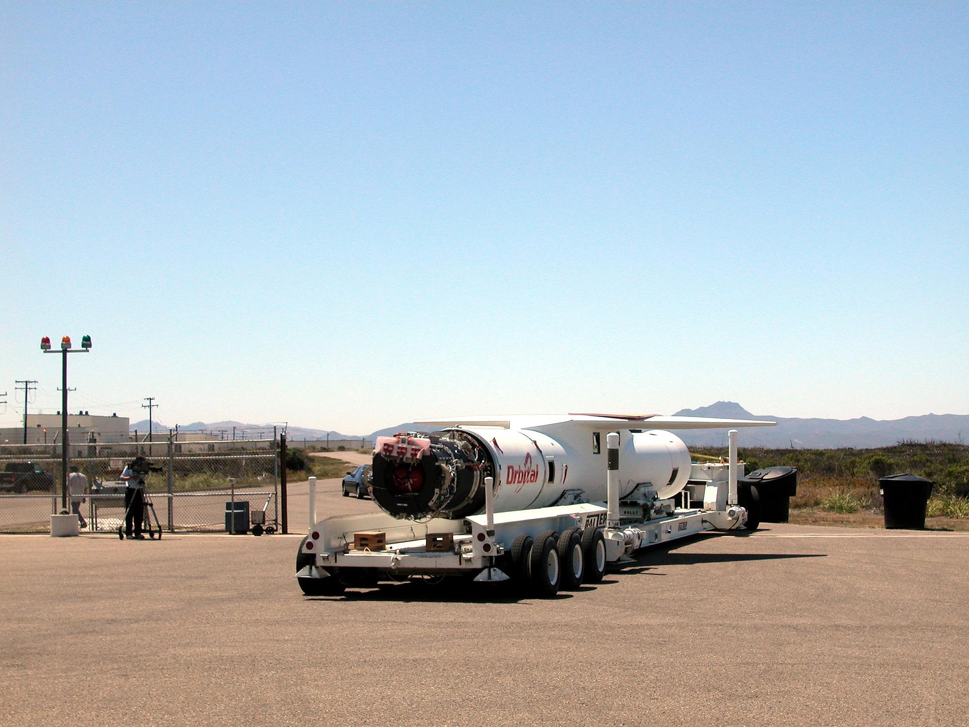 VANDENBERG AIR FORCE BASE, CALIF. - At Vandenberg Air Force Base, Calif., the Pegasus launch vehicle is moved toward its hangar. The Pegasus will carry the SciSat-1 spacecraft in a 400-mile-high polar orbit to investigate processes that control the distribution of ozone in the upper atmosphere. The data from the satellite will provide Canadian and international scientists with improved measurements relating to global ozone processes and help policymakers assess existing environmental policy and develop protective measures for improving the health of our atmosphere, preventing further ozone depletion. The mission is designed to last two years.