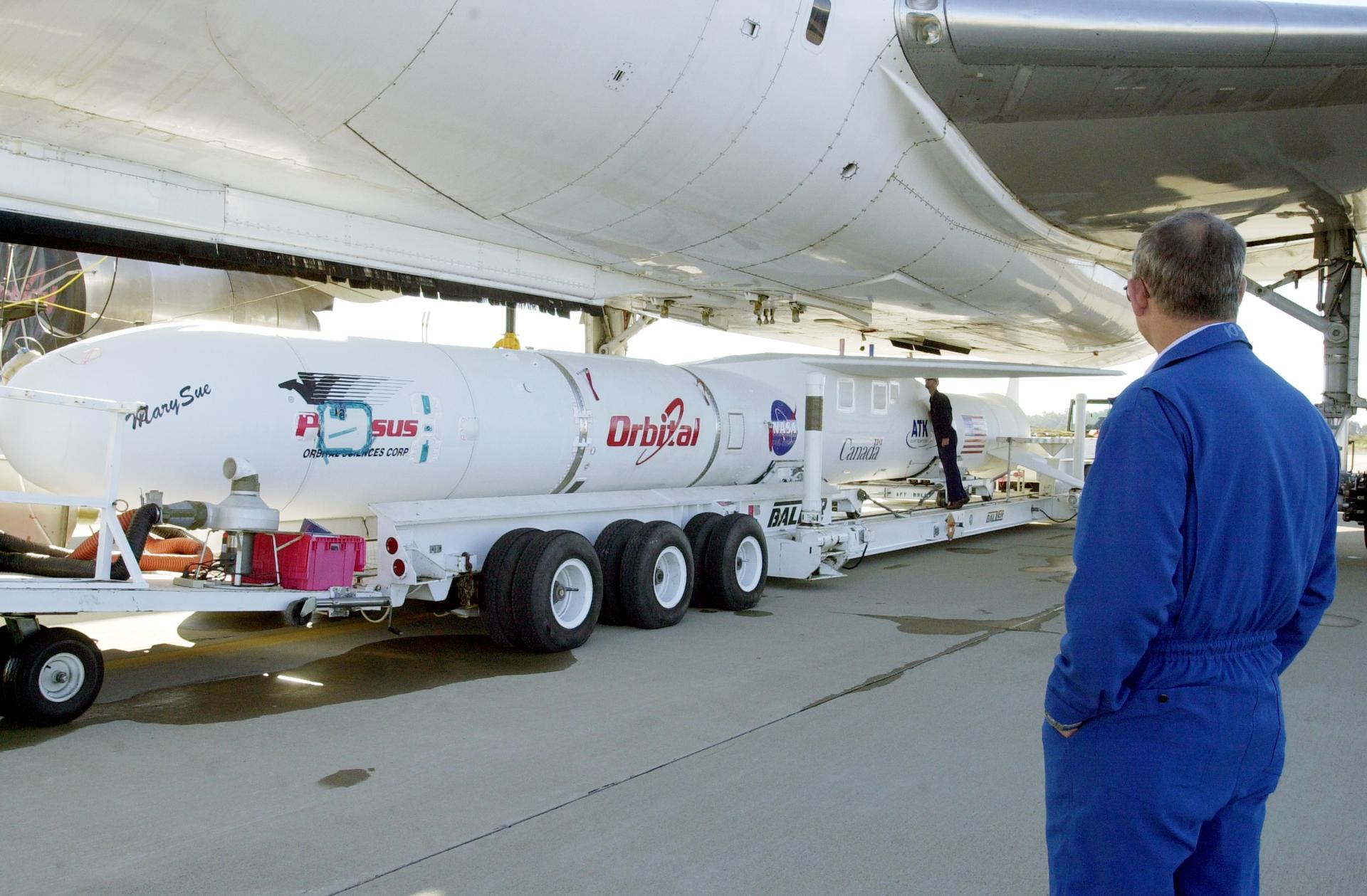 VANDENBERG AIR FORCE BASE, CALIF. - The Pegasus transporter, with its cargo of the SciSat-1 payload and Pegasus launch vehicle, moves under the L-1011 carrier aircraft for matting. The SciSat-1 weighs approximately 330 pounds and after launch will be placed in a 400-mile-high polar orbit to investigate processes that control the distribution of ozone in the upper atmosphere. The data from the satellite will provide Canadian and international scientists with improved measurements relating to global ozone processes and help policymakers assess existing environmental policy and develop protective measures for improving the health of our atmosphere, preventing further ozone depletion. The mission is designed to last two years.