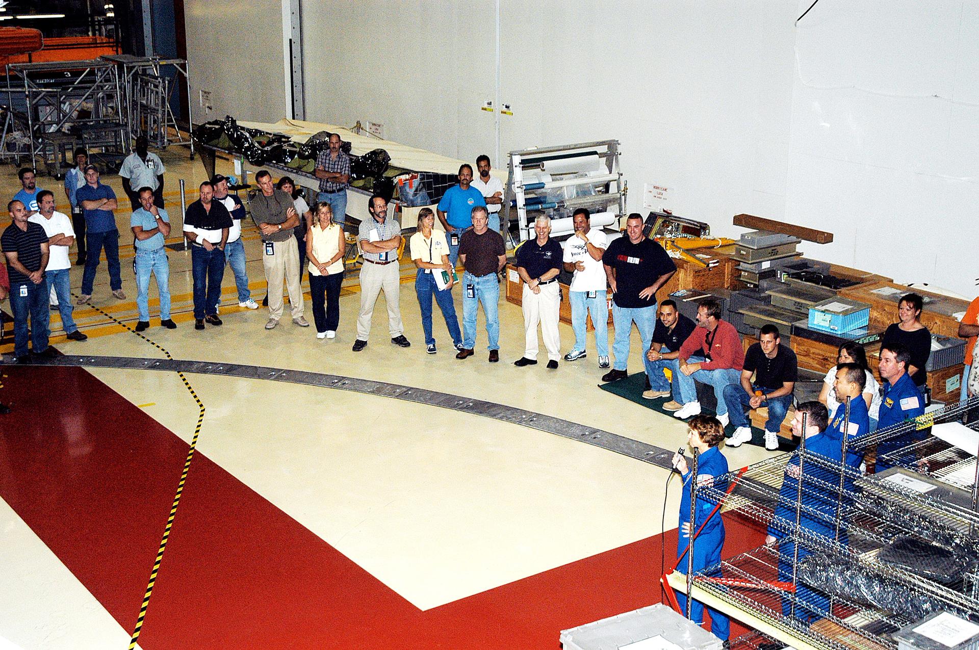 KENNEDY SPACE CENTER, FLA. - At right, STS-114 Commander Eileen Collins, Pilot James Kelly, and Mission Specialists Soichi Noguchi and Stephen Robinson talk to workers in the Orbiter Processing Facility. Noguchi is with the Japan Aerospace Exploration Agency, JAXA. The STS-114 crew is at KSC to take part in crew equipment and orbiter familiarization.