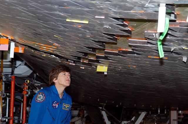 KENNEDY SPACE CENTER, FLA. - In the Orbiter Processing Facility, STS-114 Mission Specialist Wendy Lawrence takes a close look at the some of the tiles underneath Atlantis. Lawrence is a new addition to the mission crew. The STS-114 crew is at KSC to take part in crew equipment and orbiter familiarization.