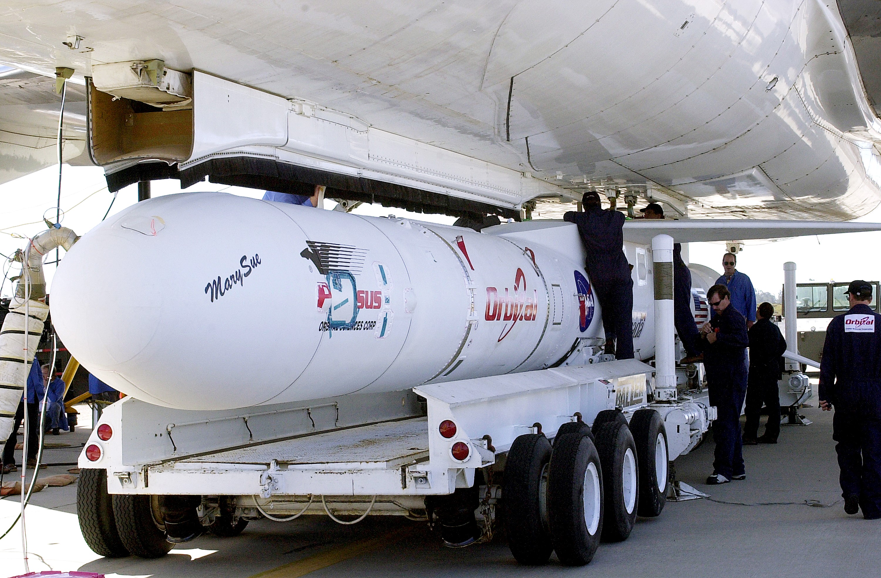 VANDENBERG AIR FORCE BASE, CALIF. - Workers mate the Pegasus , with its cargo of the SciSat-1 payload to the L-1011 carrier aircraft. The SciSat-1 weighs approximately 330 pounds and after launch will be placed in a 400-mile-high polar orbit to investigate processes that control the distribution of ozone in the upper atmosphere. The data from the satellite will provide Canadian and international scientists with improved measurements relating to global ozone processes and help policymakers assess existing environmental policy and develop protective measures for improving the health of our atmosphere, preventing further ozone depletion. The mission is designed to last two years.
