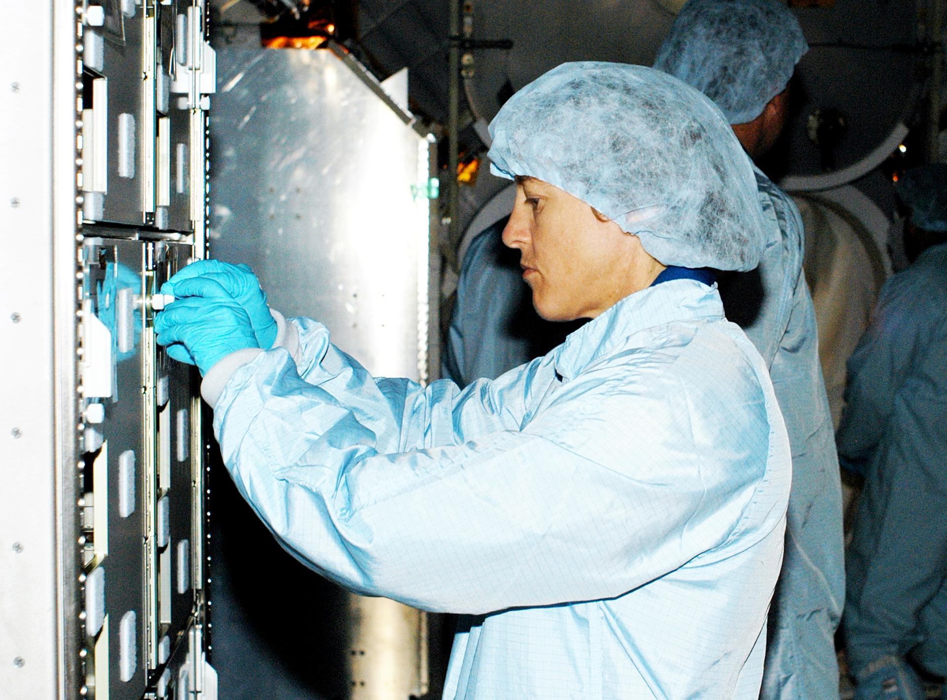 KENNEDY SPACE CENTER, FLA. - In the Space Station Processing Facility, STS-114 Mission Specialist Wendy Lawrence manipulates part of a Multi-Purpose Logistics Module. Lawrence is a new addition to the mission crew. The STS-114 crew is at KSC to take part in crew equipment and orbiter familiarization.