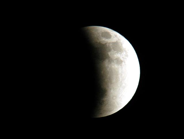KENNEDY SPACE CENTER, FLA. - The start of a lunar eclipse is viewed from Merritt Island, Fla. Eclipses occur when the Sun, Earth and Moon line up. They are rare because the Moon usually passes above or below the imaginary line connecting Earth and the Sun. The Earth casts a shadow that the Moon can pass through - when it does, it is called a lunar eclipse.