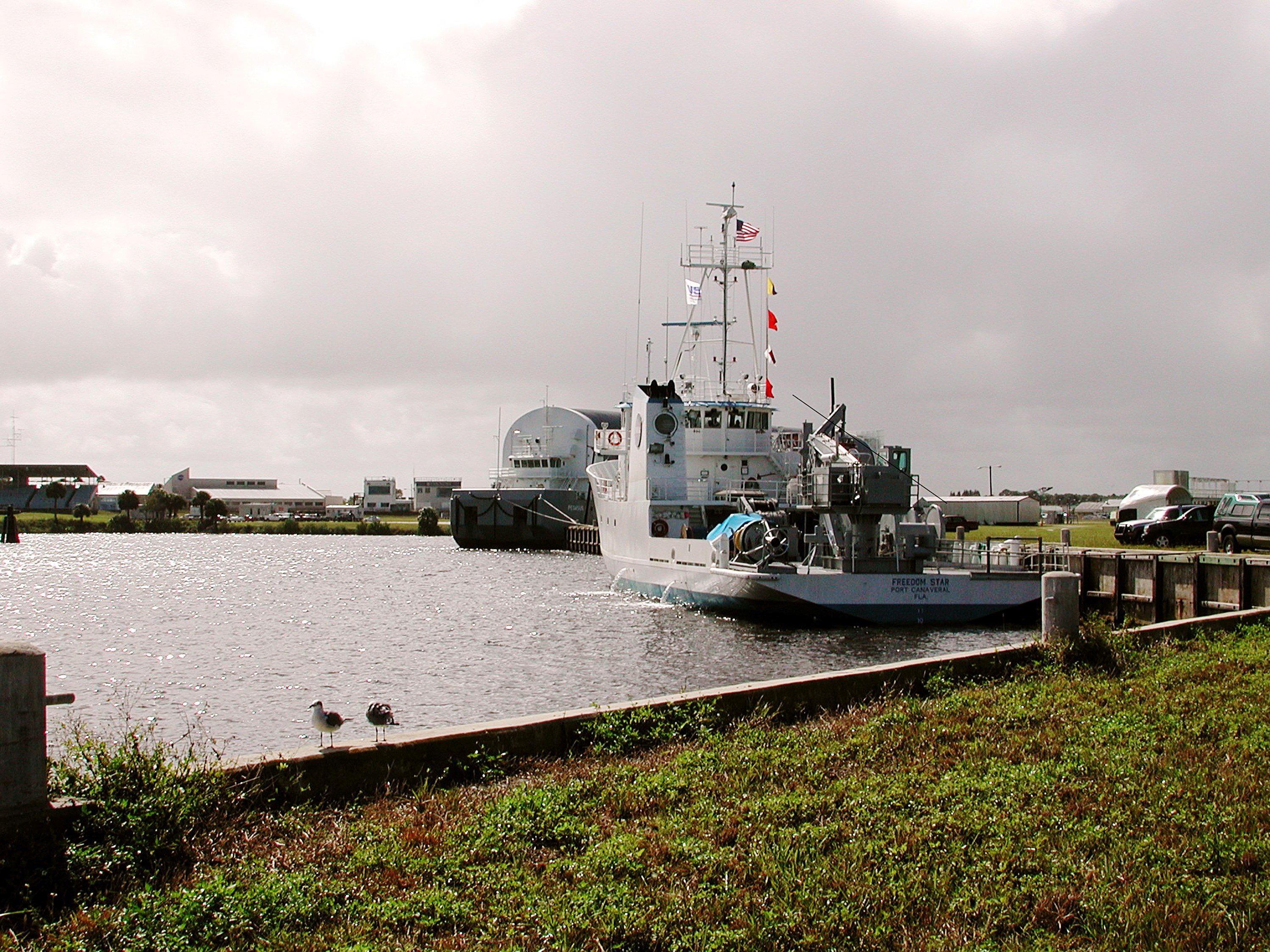 KENNEDY SPACE CENTER, FLA. - The Freedom Star is berthed at the Turn Basin near the Vehicle Assembly Building. The ship has recently returned to KSC after refurbishment at Fort George Island, Fla., including new paint. Freedom Star is one of the solid rocket booster (SRB) retrieval ships built to recover the SRB casings released over the Atlantic Ocean after launch of a Space Shuttle. In addition to the SRBs, the ship recovers the drogue and main parachutes that slow the boosters’ speed before splashdown. Some of the retrieval equipment can be seen on the rear deck. The ships also tow the external tanks built at the Michoud Space Systems Assembly Facility near New Orleans to Port Canaveral, Fla. Freedom Star was brought to KSC today for a visit by NATO Parliamentarians.