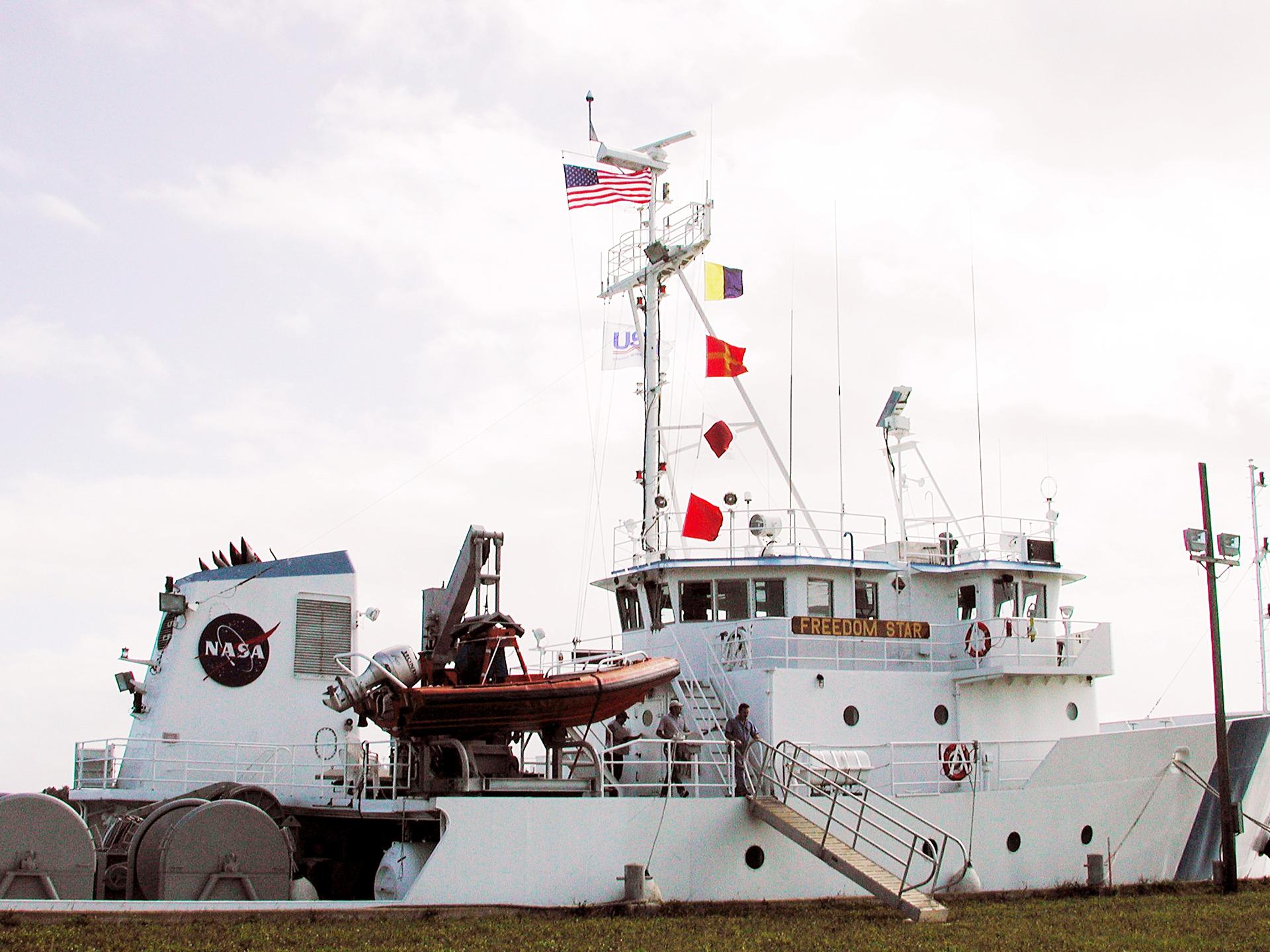 KENNEDY SPACE CENTER, FLA. - The Freedom Star is berthed at the Turn Basin near the Vehicle Assembly Building. The ship has recently returned to KSC after refurbishment at Fort George Island, Fla., including new paint. Freedom Star is one of the solid rocket booster (SRB) retrieval ships built to recover the SRB casings released over the Atlantic Ocean after launch of a Space Shuttle. In addition to the SRBs, the ship recovers the drogue and main parachutes that slow the boosters’ speed before splashdown. Some of the retrieval equipment can be seen on the rear deck. The ships also tow the external tanks built at the Michoud Space Systems Assembly Facility near New Orleans to Port Canaveral, Fla. Freedom Star was brought to KSC today for a visit by NATO Parliamentarians.
