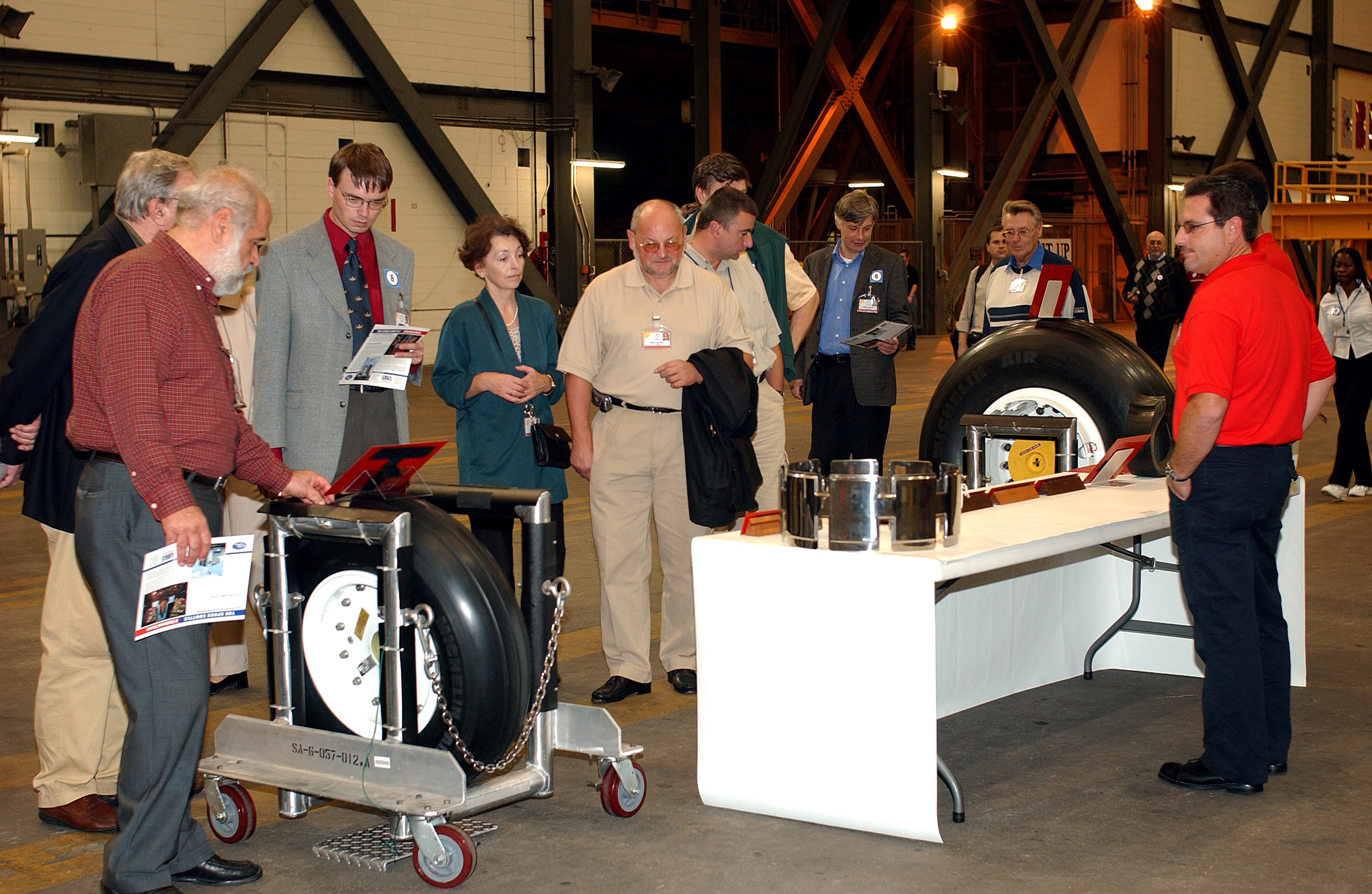 KENNEDY SPACE CENTER, FLA. - During their tour of KSC, members of the North American Treaty Organization (NATO) Parliamentary Assembly get a close look at wheels used on an orbiter. The Parliamentarians are meeting in Orlando this year for their 49th annual gathering. They chose to visit KSC with their families during their one-day excursion break from meetings.