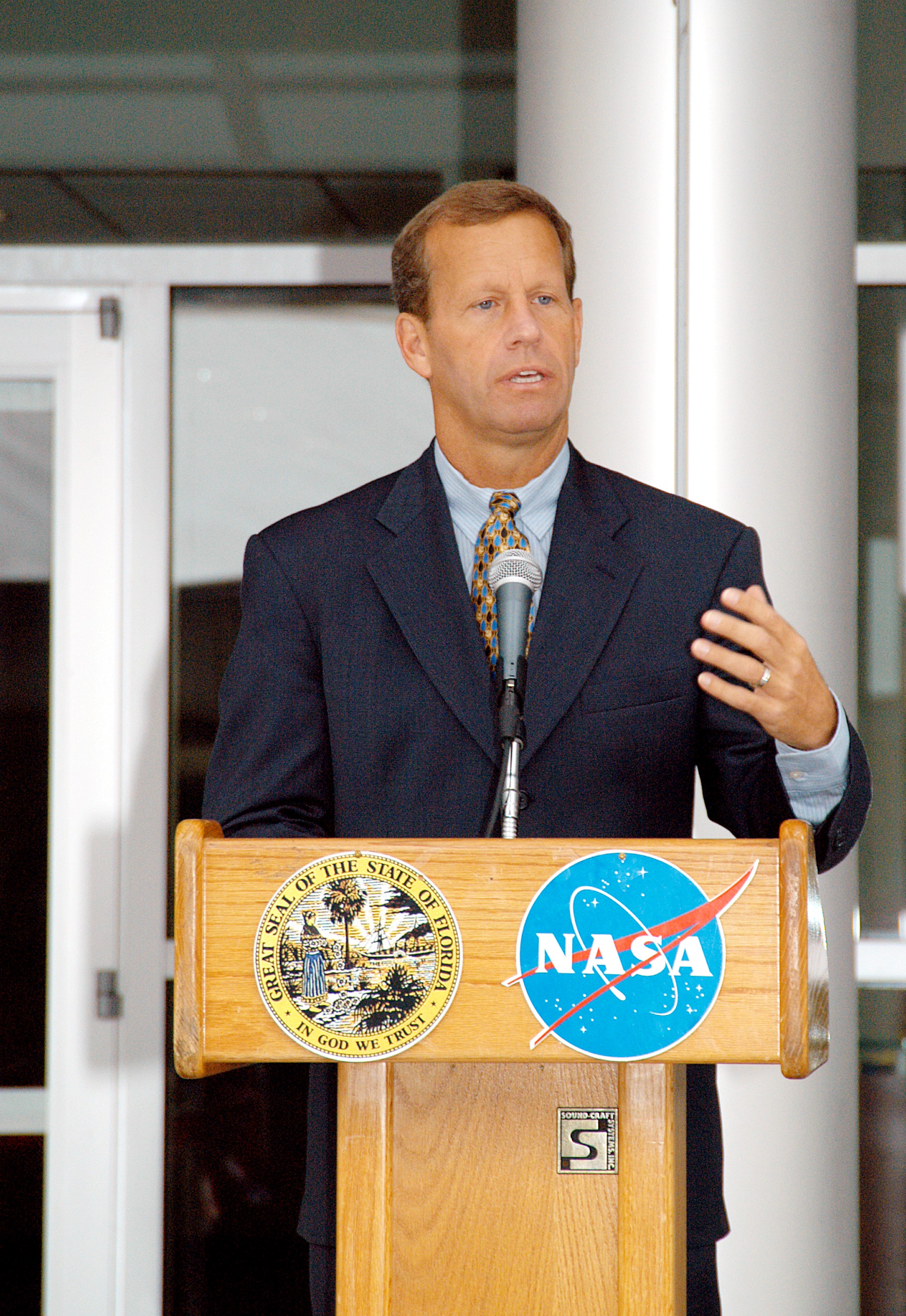 KENNEDY SPACE CENTER, FLA. - Frank T. Brogan, president of the Florida Atlantic University, speaks at a dedication and ribbon-cutting ceremony for the Space Life Sciences Lab hosted by NASA-Kennedy Space Center and the state of Florida at the new lab. Completed in August, the facility encompasses more than 100,000 square feet and was formerly known as the Space Experiment Research and Processing Laboratory or SERPL. The state, through the Florida Space Authority, built the research lab which is host to NASA, NASA’s Life Sciences Services contractor Dynamac Corp., Bionetics Corp., and researchers from the University of Florida. Dynamac Corp. leases the facility. The Florida Space Research Institute is responsible for gaining additional tenants from outside the NASA community.