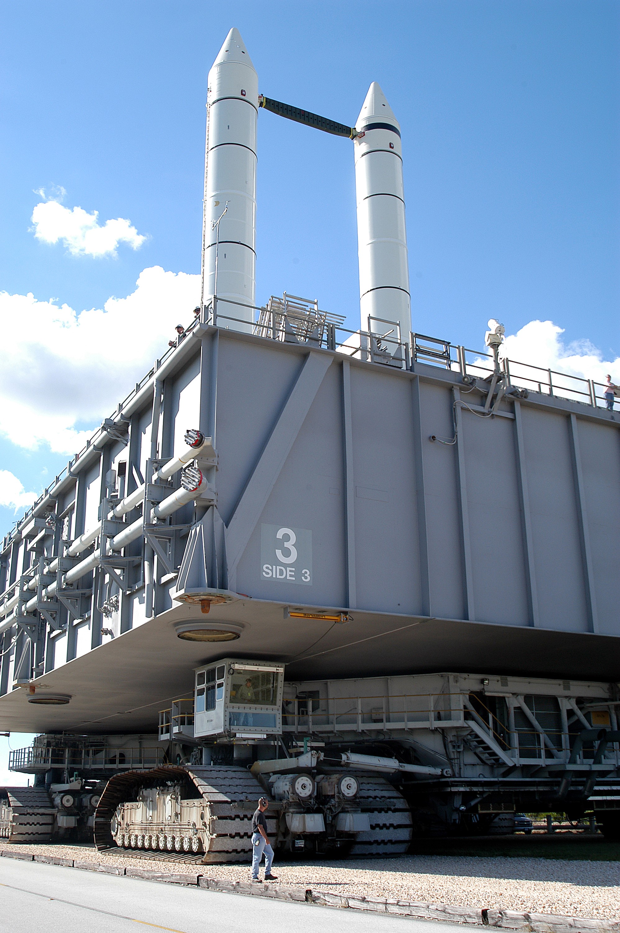 KENNEDY SPACE CENTER, FLA. - A Kennedy Space Center technician monitors the performance of a crawler-transporter as it moves Mobile Launcher Platform (MLP) number 3, with a set of twin solid rocket boosters bolted atop, to the intersection in the crawlerway during the second engineering analysis vibration test on the crawler and MLP. The crawler is moving at various speeds up to 1 mph in an effort to achieve vibration data gathering goals as it leaves the VAB, travels toward Launch Pad 39A, and then returns. The boosters are braced at the top for stability. The primary purpose of these rollout tests is to gather data to develop future maintenance requirements on the transport equipment and the flight hardware. Various parts of the MLP and crawler transporter have been instrumented with vibration data collection equipment.