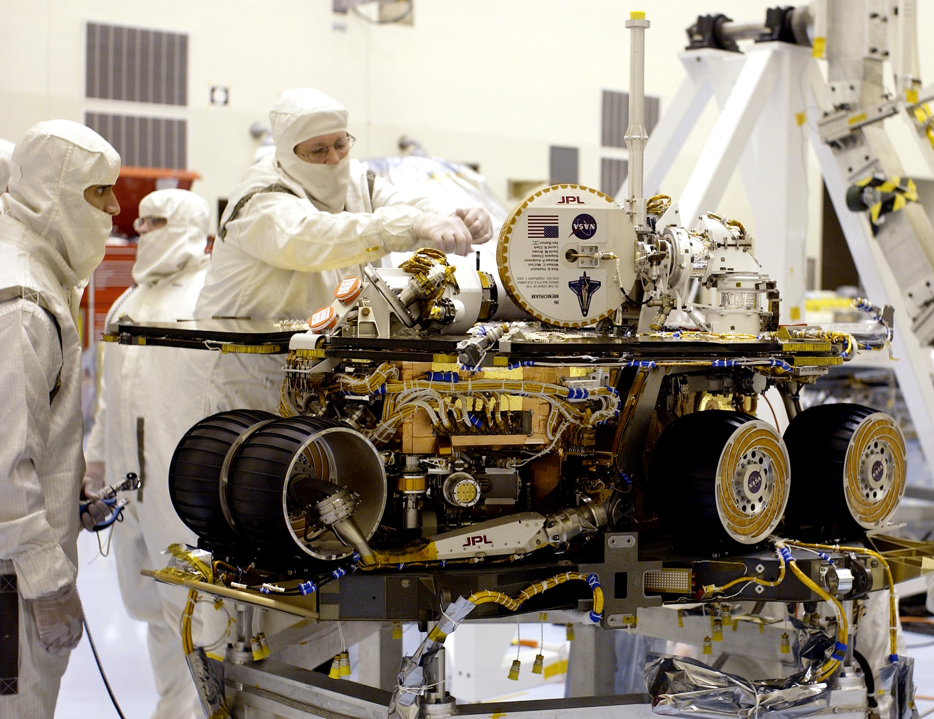 KENNEDY SPACE CENTER, FLA. -- This plaque commemorating the STS-107 Space Shuttle Columbia crew now looks over the Mars landscape after the successful landing and deployment of the Mars Exploration Rover “Spirit” Jan. 4 onto the red planet. The plaque, mounted on the high-gain antenna, is shown while the rover underwent final checkout March 28, 2003, in the Payload Hazardous Servicing Facility at KSC.