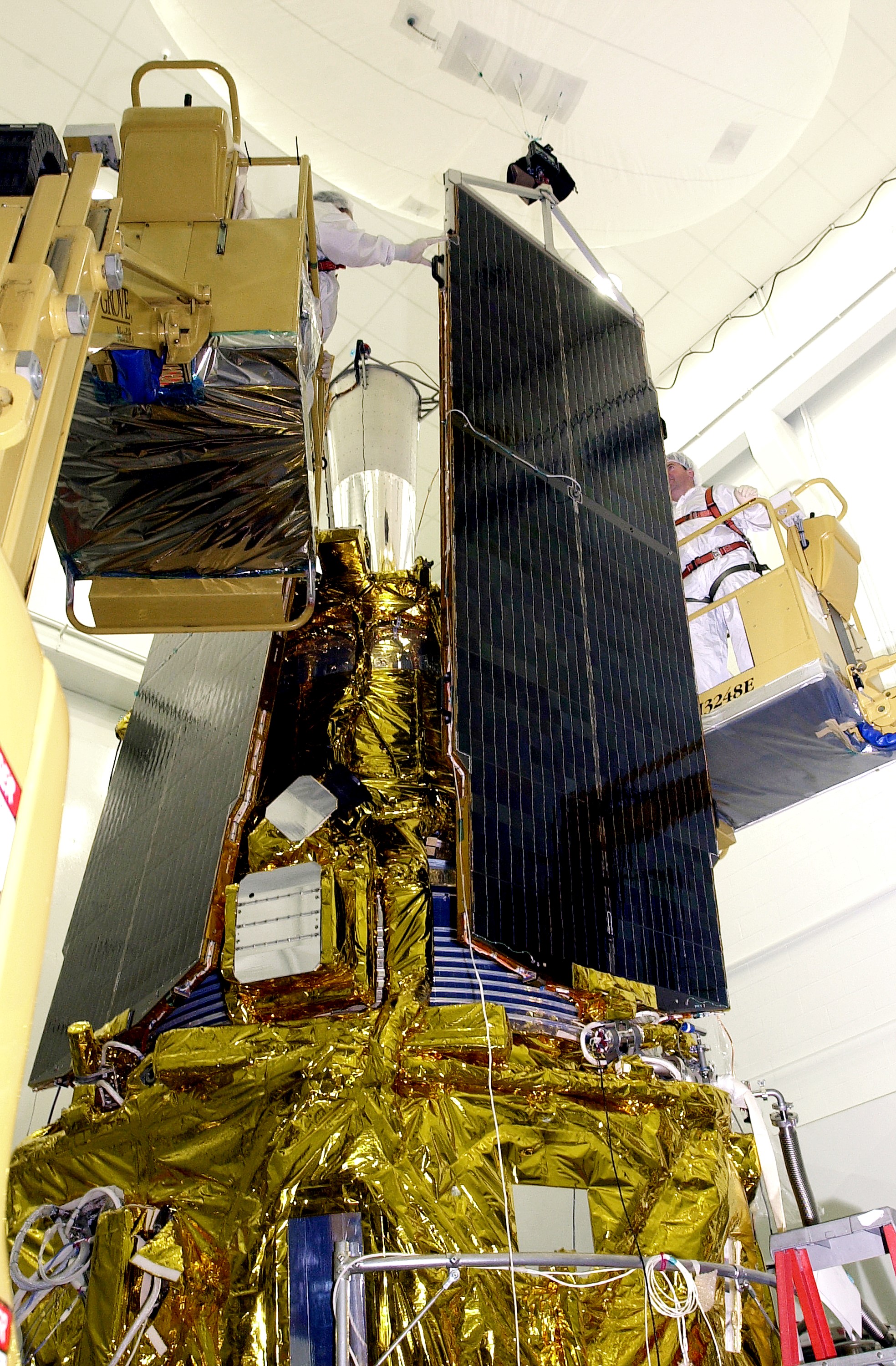 VANDENBERG AFB, CALIF. - In the NASA spacecraft processing facility on North Vandenberg Air Force Base, workers prepare to attach the top of a solar array panel onto the Gravity Probe B spacecraft. Installing each array is a 3-day process and includes a functional deployment test. The Gravity Probe B mission is a relativity experiment developed by NASA’s Marshall Space Flight Center, Stanford University and Lockheed Martin. The spacecraft will test two extraordinary predictions of Albert Einstein’s general theory of relativity that he advanced in 1916: the geodetic effect (how space and time are warped by the presence of the Earth) and frame dragging (how Earth’s rotation drags space and time around with it). Gravity Probe B consists of four sophisticated gyroscopes that will provide an almost perfect space-time reference system. The mission will look in a precision manner for tiny changes in the direction of spin.