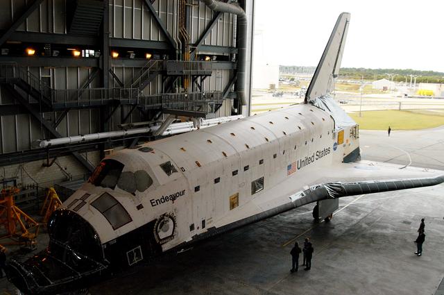 KENNEDY SPACE CENTER, FLA. -- Endeavour rolls into the Vehicle Assembly Building (VAB) for temporary storage. The orbiter has been moved from the Orbiter Processing Facility (OPF) to allow work to be performed in the OPF that can only be accomplished while the bay is empty. Work scheduled in the OPF includes annual validation of the bay’s cranes, work platforms, lifting mechanisms and jack stands. Endeavour will remain in the VAB for approximately 12 days, then return to the OPF.
