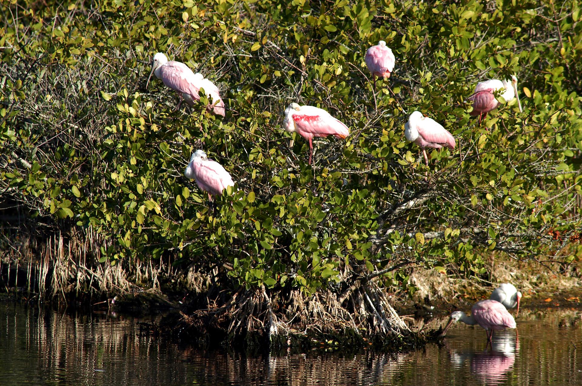KENNEDY SPACE CENTER, FLA. -- A group of roseate spoonbills share their watery hunting ground with a lone white ibis near KSC. Spoonbills prefer to inhabit mangroves, ranging from the coasts of southern Florida, Louisiana and Texas, to the West Indies, Mexico, Central and South America. They feed on shrimps and fish in shallow waters. Spoonbills are one of 310 species of birds that inhabit the Merritt Island National Wildlife Refuge, which shares a boundary with KSC. The marshes and open water of the refuge also provide wintering areas for 23 species of migratory waterfowl, as well as a year-round home for great blue herons, great egrets, wood storks, cormorants, brown pelicans and other species of marsh and shore birds.