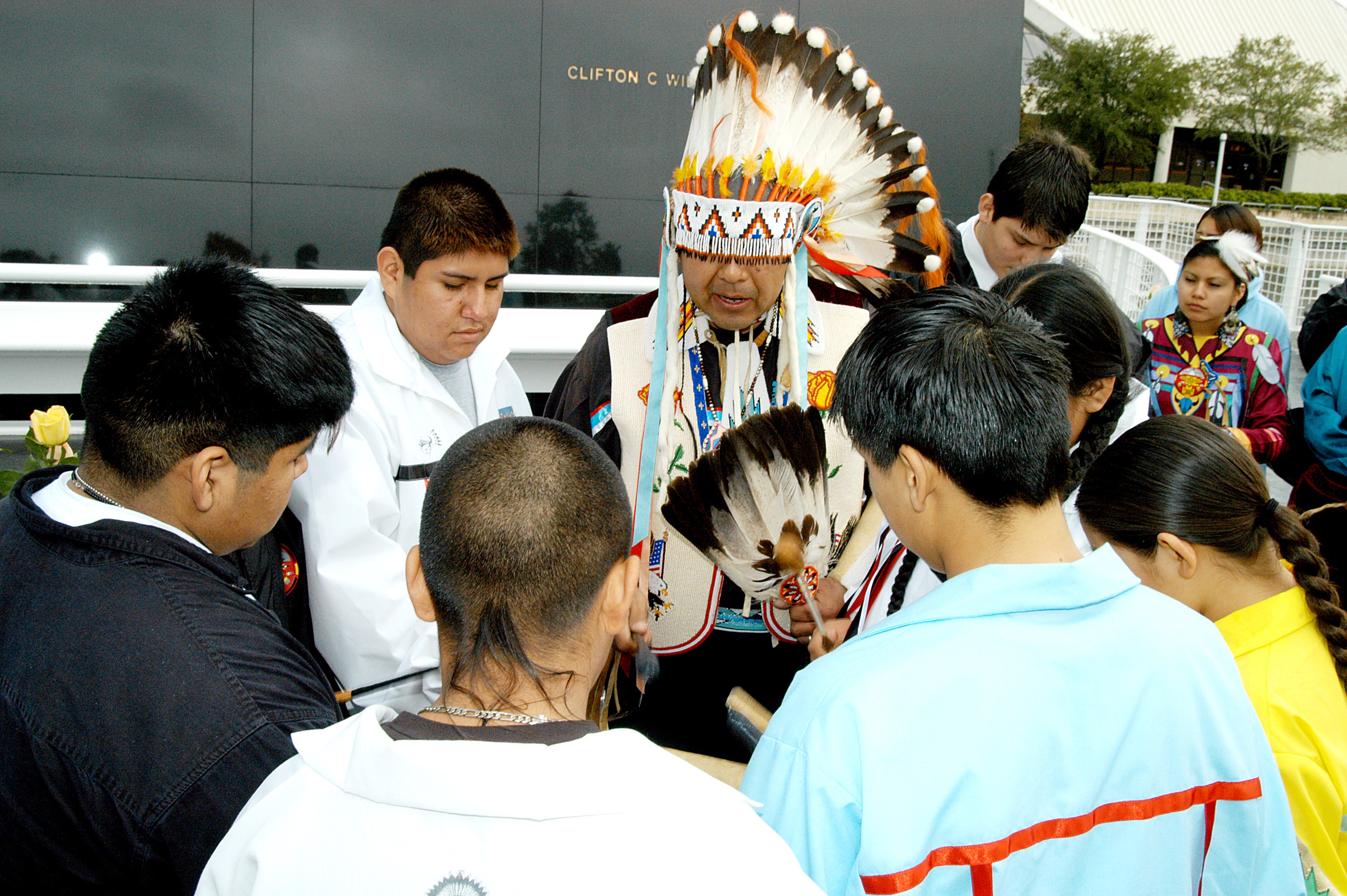 KENNEDY SPACE CENTER, FLA. - Dancers from the Shoshone-Bannock Junior-Senior High School, Fort Hall, Idaho, perform a healing ceremony during the memorial service held at the Space Memorial Mirror for the crew of Columbia. Feb. 1 is the one-year anniversary of the loss of the crew and orbiter Columbia in a tragic accident as the ship returned to Earth following mission STS-107. Students and staff of the Shoshone-Bannock Nation had an experiment on board Columbia. The public was invited to the memorial service, held in the KSC Visitor Complex, which included comments by Center Director Jim Kennedy and Executive Director of Florida Space Authority Winston Scott. Scott is a former astronaut who flew on Columbia in 1997.