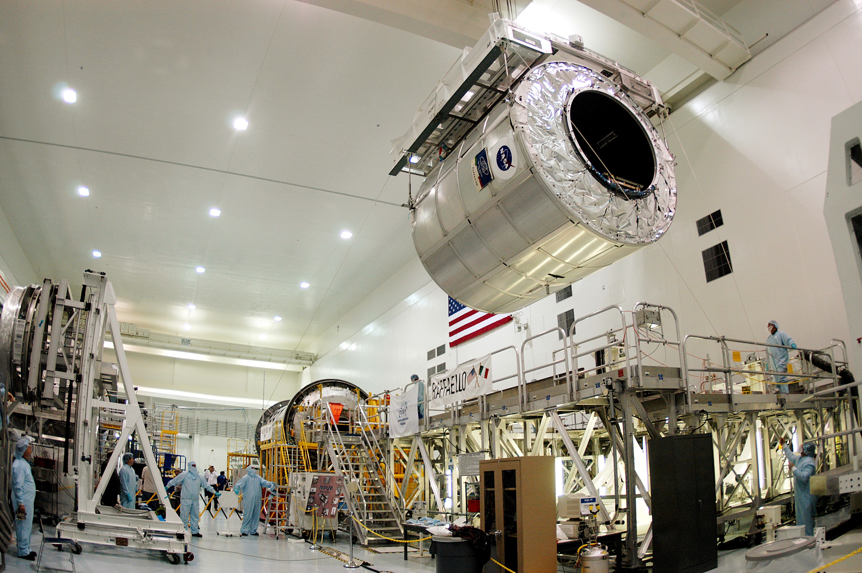 KENNEDY SPACE CENTER, FLA. - The Multi-Purpose Logistics Module Raffaello moves away from its stand in the Space Station Processing Facility. Raffaello is the second MPLM built by the Italian Space Agency, serving as a reusable logistics carrier and primary delivery system to resupply and return station cargo requiring a pressurized environment. It is being moved to allow the third MPLM, Donatello, to be brought in for routine testing. Donatello has been stored in the Operations and Checkout Building. This is the first time all three MPLMs are in the SSPF; the other one is the Leonardo. Raffaello is scheduled to fly on Space Shuttle Atlantis on mission STS-114.