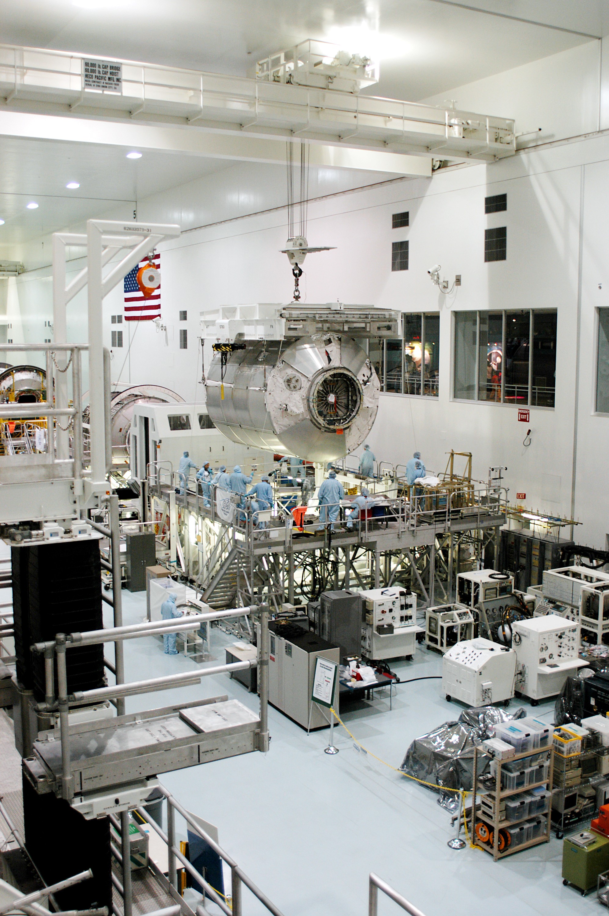 KENNEDY SPACE CENTER, FLA. - In the Space Station Processing Facility, the Multi-Purpose Logistics Module Donatello is slowly lowered toward a work stand. Previously housed in the Operations and Checkout Building, Donatello was brought into the SSPF for routine testing. This is the first time all three MPLMs (Donatello, Raffaello and Leonardo) are in the SSPF. The MPLMs were built by the Italian Space Agency, to serve as reusable logistics carriers and the primary delivery system to resupply and return station cargo requiring a pressurized environment. The third MPLM, Raffaello is scheduled to fly on Space Shuttle Atlantis on mission STS-114.