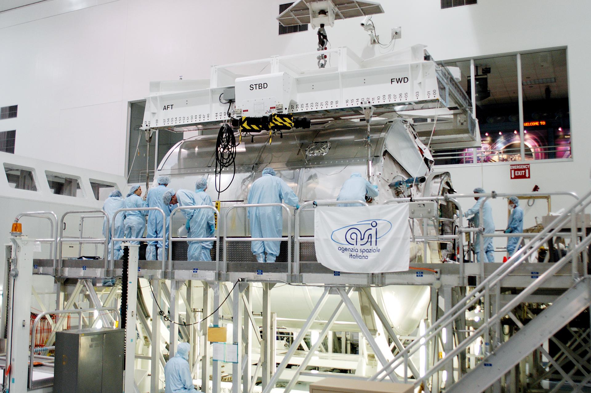 KENNEDY SPACE CENTER, FLA. - In the Space Station Processing Facility, workers confirm the Multi-Purpose Logistics Module Donatello is safely in place on a work stand. Previously housed in the Operations and Checkout Building, Donatello was brought into the SSPF for routine testing. This is the first time all three MPLMs (Donatello, Raffaello and Leonardo) are in the SSPF. The MPLMs were built by the Italian Space Agency, to serve as reusable logistics carriers and the primary delivery system to resupply and return station cargo requiring a pressurized environment. The third MPLM, Raffaello, is scheduled to fly on Space Shuttle Atlantis on mission STS-114.
