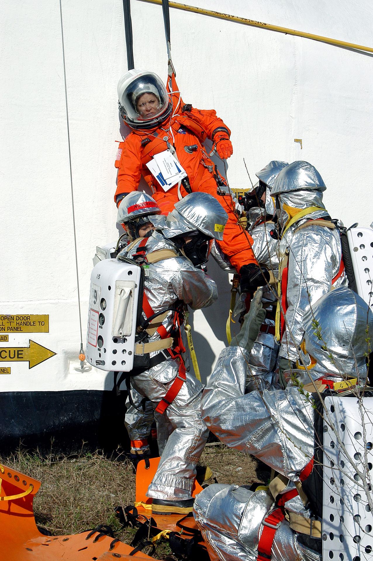 KENNEDY SPACE CENTER, FLA. - Emergency crew members on the ground take hold of a volunteer “astronaut” lowered from the top of the orbiter crew compartment mock-up that is the scene of a “Mode VII” emergency landing simulation at Kennedy Space Center. The purpose of the Mode VII is to exercise emergency preparedness personnel, equipment and facilities in rescuing astronauts from a downed orbiter and providing immediate medical attention. This simulation presents an orbiter that has crashed short of the Shuttle Landing Facility in a wooded area 2-1/2 miles south of Runway 33. Emergency crews are responding to the volunteer astronauts who are simulating various injuries. Rescuers must remove the crew, provide triage and transport to hospitals those who need further treatment. Local hospitals are participating in the exercise.