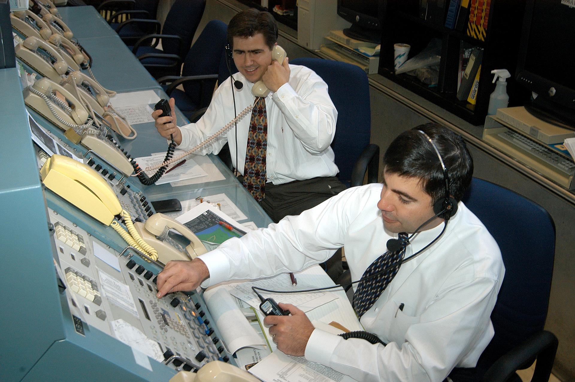 KENNEDY SPACE CENTER, FLA. - In the Launch Control Center, Robert Holl (left), Landing Recovery directo, and Donald Hammel, from the Shuttle Project Office, are in contact with the leaders of the “Mode VII” emergency landing simulation at Kennedy Space Center. The simulation is being managed and directed from the LCC. The purpose of the Mode VII is to exercise emergency preparedness personnel, equipment and facilities in rescuing astronauts from a downed orbiter and providing immediate medical attention. This simulation presents an orbiter that has crashed short of the Shuttle Landing Facility in a wooded area 2-1/2 miles south of Runway 33. Emergency crews are responding to the volunteer “astronauts” who are simulating various injuries inside the crew compartment mock-up. Rescuers must remove the crew, provide triage and transport to hospitals those who need further treatment. Local hospitals are participating in the exercise.