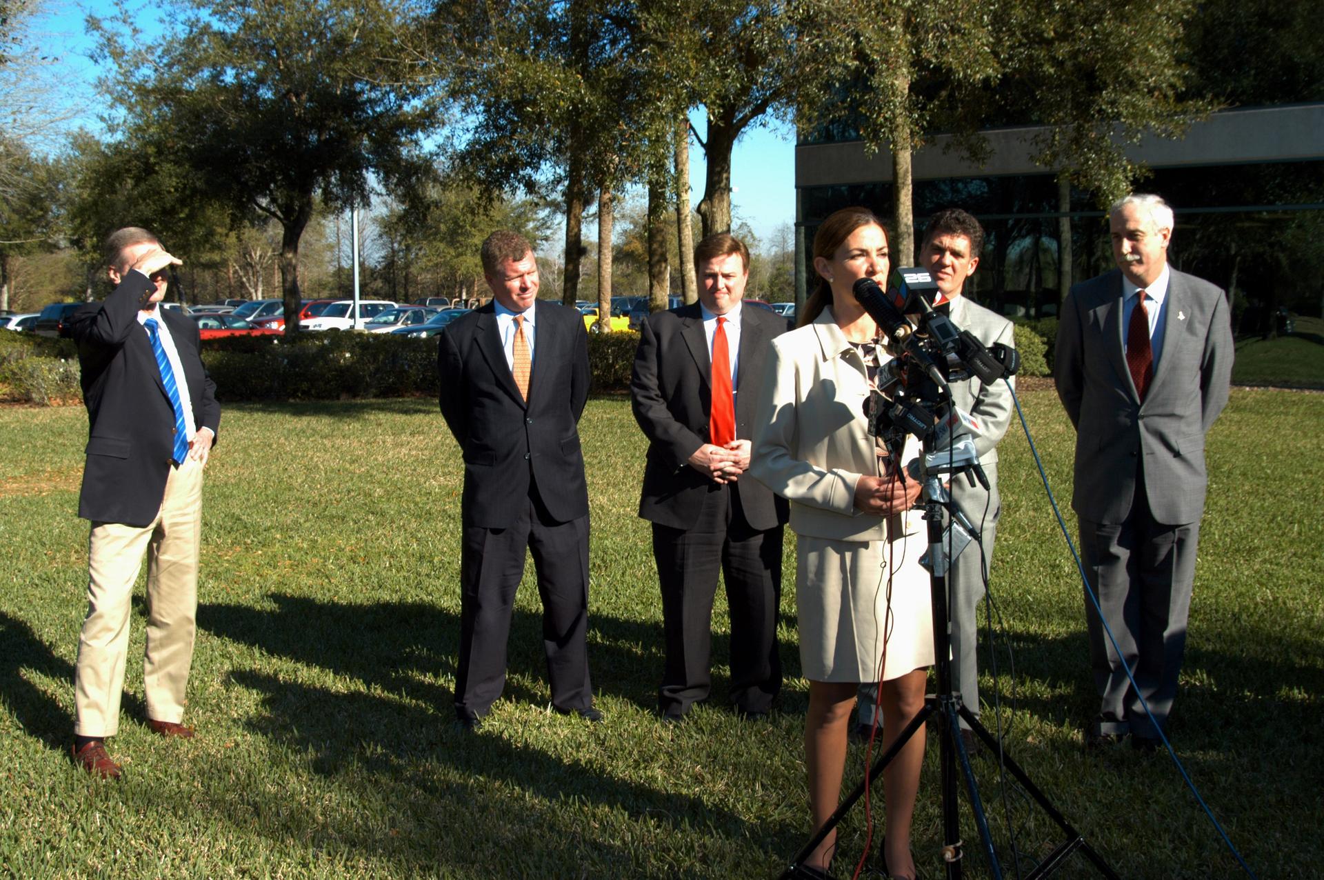 KENNEDY SPACE CENTER, FLA. - Pamella J. Dana, Ph.D., director, Office of Tourism, Trade, and Economic Development in Florida, talks to the media at the Central Florida Research Park, near Orlando. She gave a presentation to NASA Administrator Sean O’Keefe (far right) about the assets of the research park as the site of NASA’s new Shared Services Center. Behind Dana are (left to right) U.S. Senator Bill Nelson, Florida Congressman Tom Feeney; U.S. Representative Ric Keller; and Congressman Dave Weldon. Six sites around the U.S. are under consideration for location of the Center, which would centralize NASA’s payroll, accounting, human resources, facilities and procurement offices that are now handled at each field center. The consolidation is part of the One NASA focus. Center Director Jim Kennedy also attended the presentation.