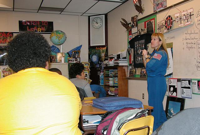 KENNEDY SPACE CENTER, FLA. - Astronaut Kay Hire talks to students in Garland V. Stewart Magnet Middle School, a NASA Explorer School (NES) in Tampa, Fla. She joined Center Director Jim Kennedy in sharing the agency’s new vision for space exploration with the next generation of explorers. Kennedy is talking with students about our destiny as explorers, NASA’s stepping stone approach to exploring Earth, the Moon, Mars and beyond, how space impacts our lives, and how people and machines rely on each other in space.