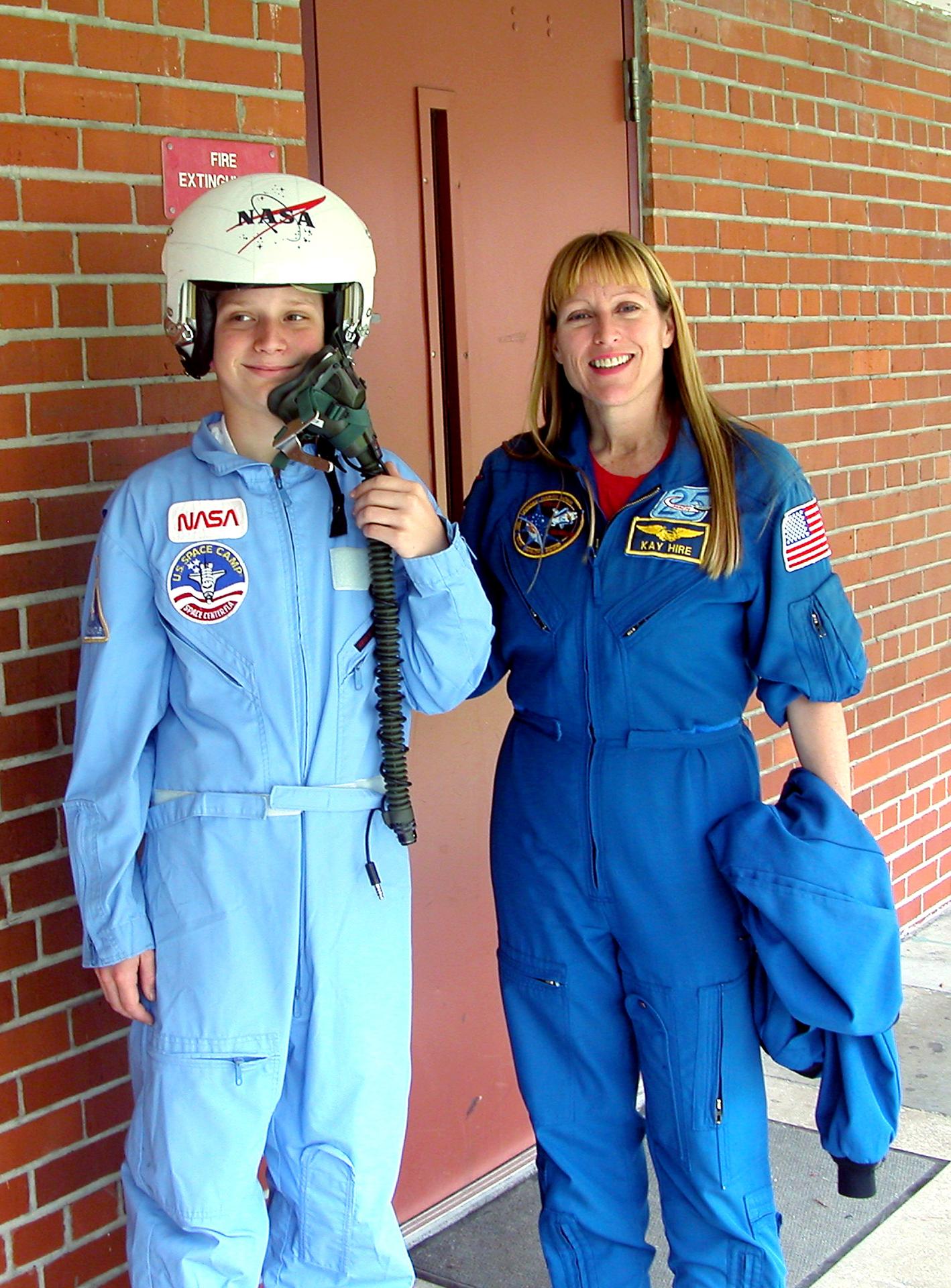 KENNEDY SPACE CENTER, FLA. - Astronaut Kay Hire poses with 8th grader Kristy Wiggins at Garland V. Stewart Magnet Middle School, a NASA Explorer School (NES) in Tampa, Fla. Hire joined Center Director Jim Kennedy at the school in sharing the agency’s new vision for space exploration with the next generation of explorers. Kennedy is talking with students about our destiny as explorers, NASA’s stepping stone approach to exploring Earth, the Moon, Mars and beyond, how space impacts our lives, and how people and machines rely on each other in space.
