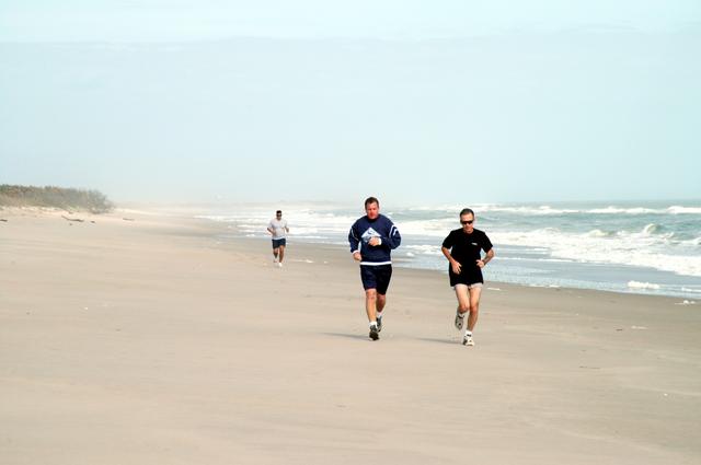 KENNEDY SPACE CENTER, FLA. - Congressman Tom Feeney (left) jogs along the beach at Kennedy Space Center. Accompanying him is Ricky D. O’Quinn, a member of the KSC SWAT team. Behind them is Ivan Osores, with Security. During January and February, Congressman Feeney traveled the entire coastline of Florida’s 24th District, and concluded his walks March 1 in Brevard County. On his walks, he met with constituents and community leaders to discuss legislative issues that will be addressed by the 108th Congress.
