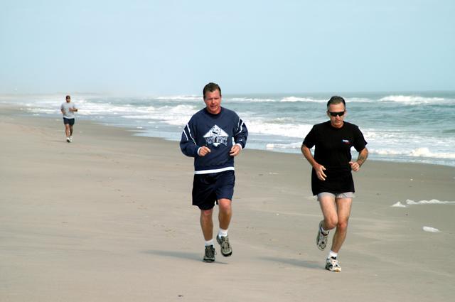 KENNEDY SPACE CENTER, FLA. - Congressman Tom Feeney (left) jogs along the beach at Kennedy Space Center. Accompanying him is Ricky D. O’Quinn, a member of the KSC SWAT team. In the background is Ivan Osores, with Security. During January and February, Congressman Feeney traveled the entire coastline of Florida’s 24th District, and concluded his walks March 1 in Brevard County. On his walks, he met with constituents and community leaders to discuss legislative issues that will be addressed by the 108th Congress.