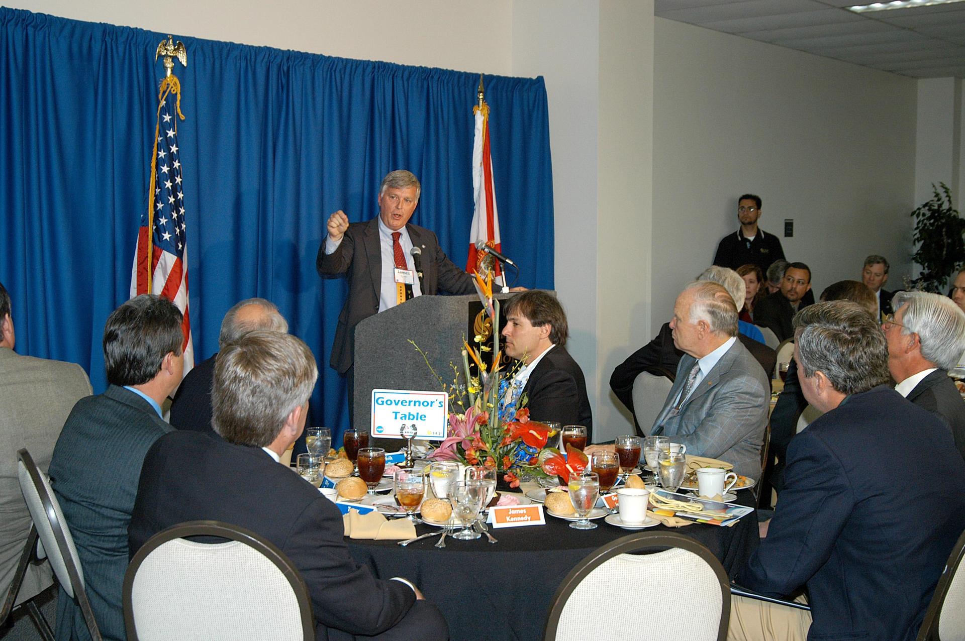 KENNEDY SPACE CENTER, FLA. - During the luncheon held at the 2004 Florida Regional FIRST competition at the University of Central Florida, Center Director Jim Kennedy praises the teamwork of the students involved. The event hosted 41 teams from Canada, Brazil, Great Britain and the United States. Florida Gov. Jeb Bush also spoke at the luncheon. FIRST is a nonprofit organization, For Inspiration and Recognition of Science and Technology, that sponsors the event pitting gladiator robots against each other in an athletic-style competition. The FIRST robotics competition is designed to provide students with a hands-on, inside look at engineering and other professional careers, pairing high school students with engineer mentors and corporations.