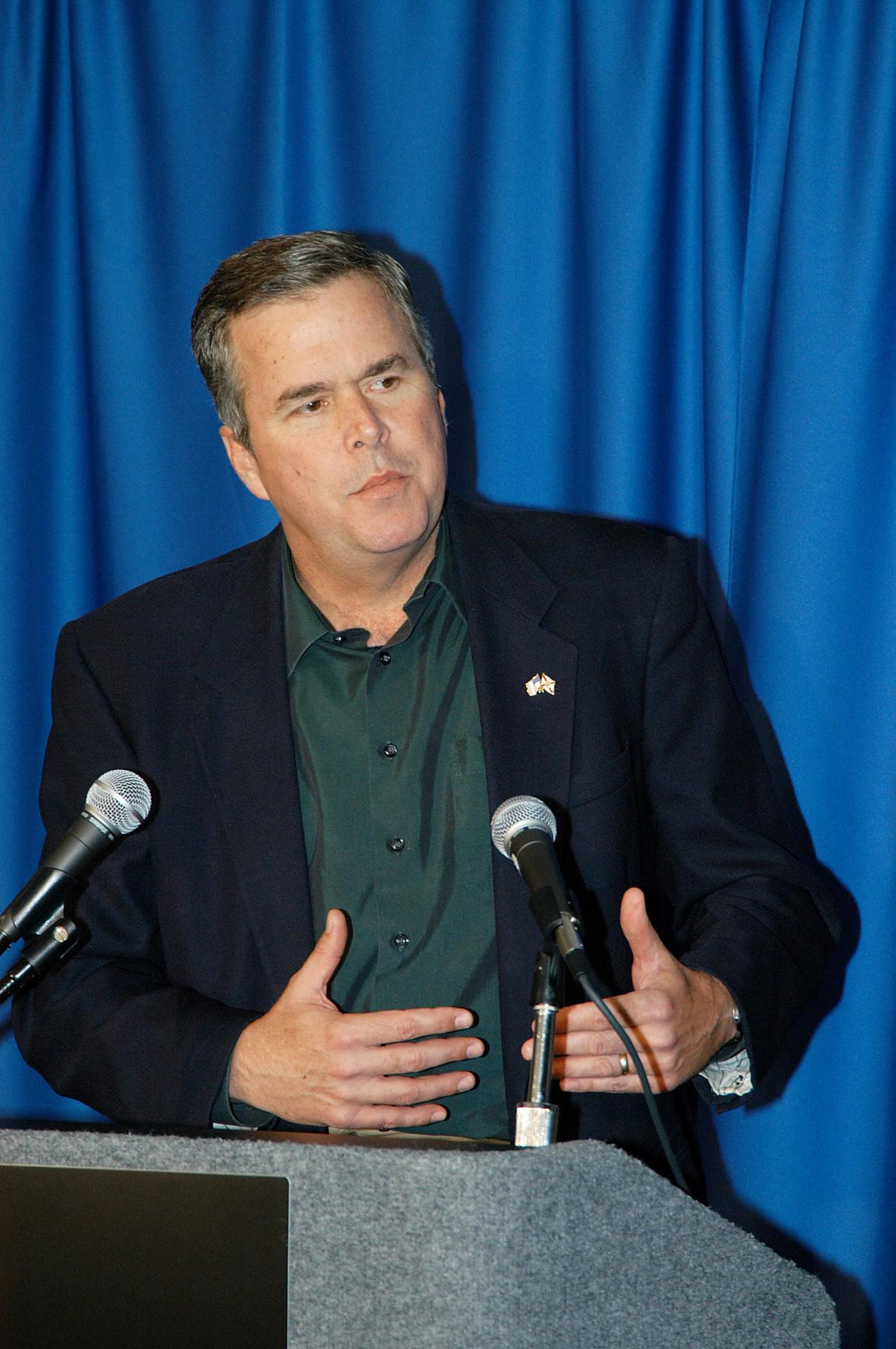 KENNEDY SPACE CENTER, FLA. - Florida Gov. Jeb Bush speaks to attendees at the luncheon held at the 2004 Florida Regional FIRST competition at the University of Central Florida. The event hosted 41 teams from Canada, Brazil, Great Britain and the United States. Center Director Jim Kennedy also spoke at the luncheon. FIRST is a nonprofit organization, For Inspiration and Recognition of Science and Technology, that sponsors the event pitting gladiator robots against each other in an athletic-style competition. The FIRST robotics competition is designed to provide students with a hands-on, inside look at engineering and other professional careers, pairing high school students with engineer mentors and corporations.